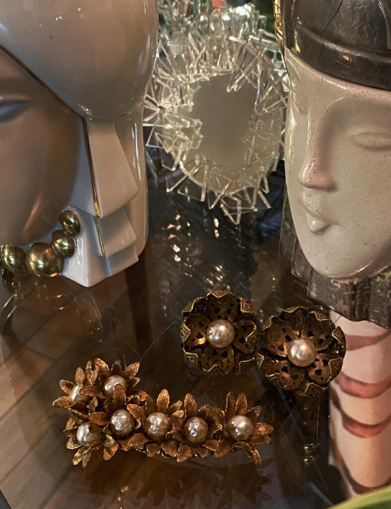 ◆ 本日は10:00-17:00で営業中です。ご来店お待ちしております。写真はmiriamhaskellのブローチとjoseff of Hollywood のブローチです。