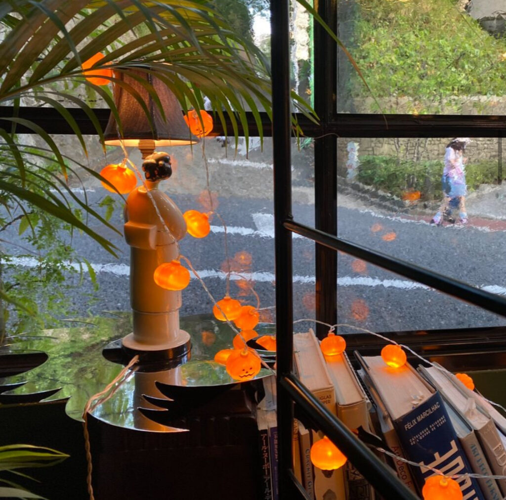 写真は何年か前のベルカプリの窓際。Robjの着物の女性にかぼちゃのランタンをデコレーションしていたのだな~。