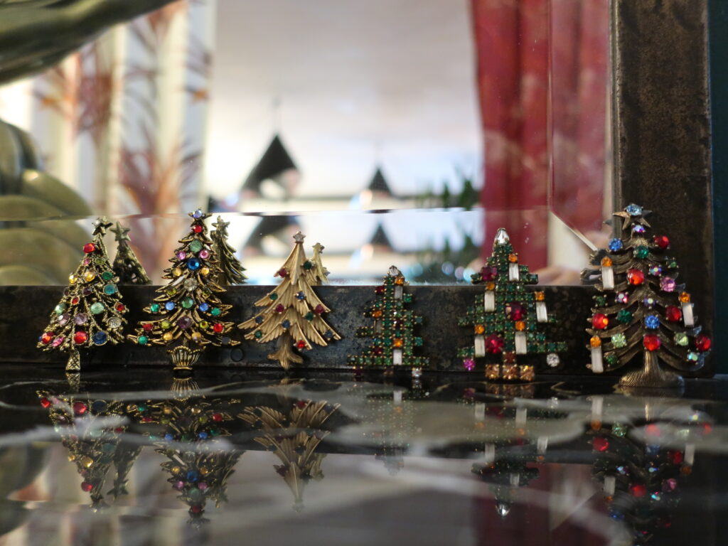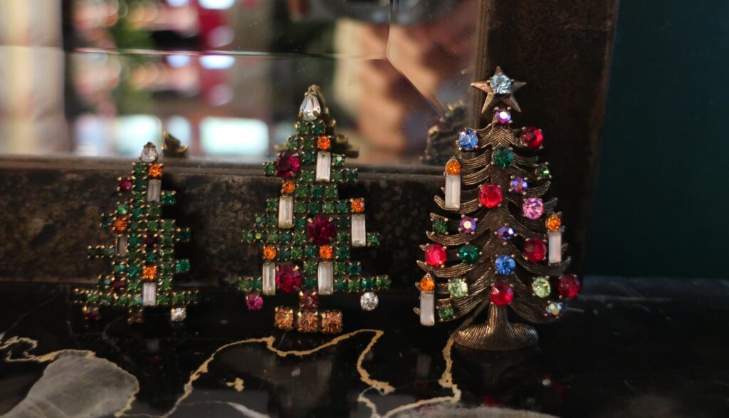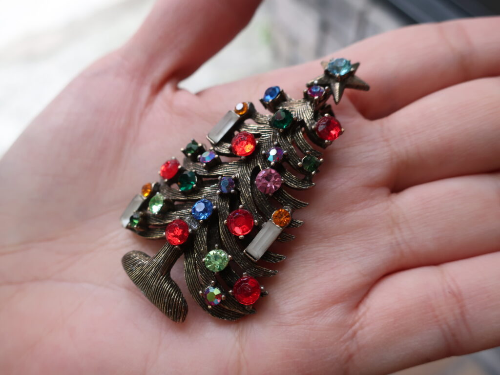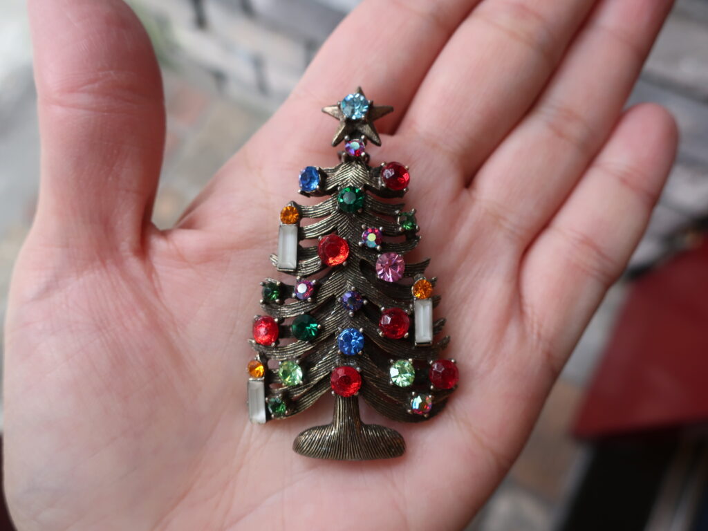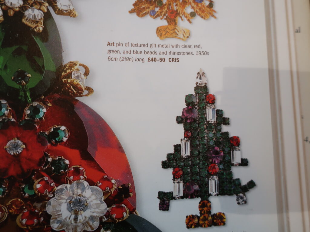コスチュームジュエリー本のクリスマスツリーブローチの紹介ページを見るのは楽しいです。しっかりもみの木の形をした正統派なデザインから楽しくデフォルメされたものまで。コレクションを始めたらそれこそキリがないカテゴリーだな~。手を出すまい!と心に誓う私ですが自分がいいと思った長く楽しめそうなツリーならスペースが許す限り手元に迎えたいです。
