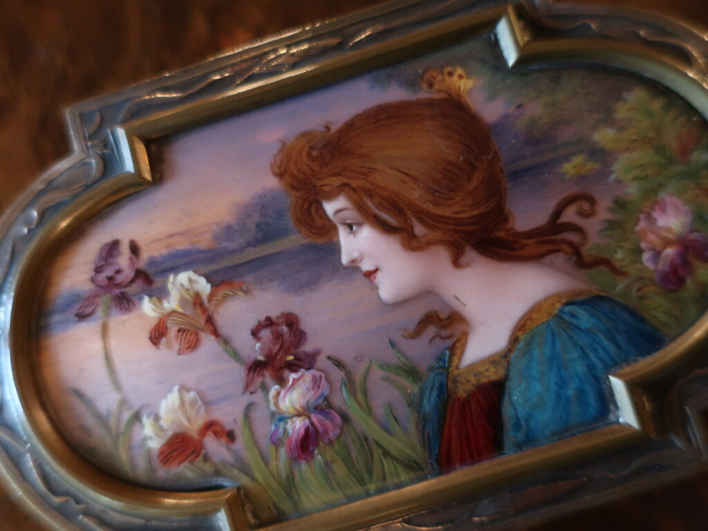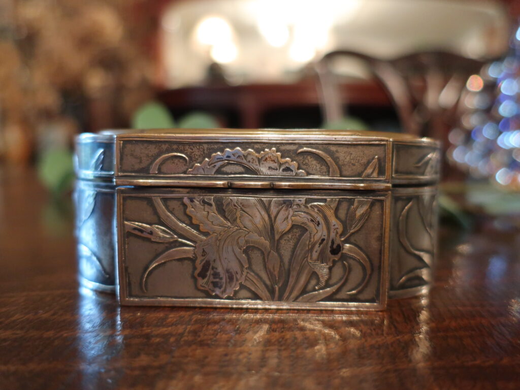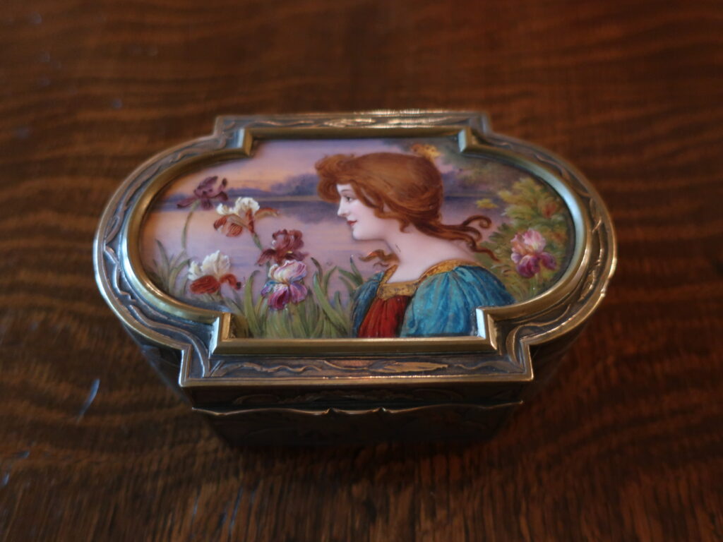 エナメルで描かれたアイリスはボックスの側面、シルバーの細工でも描かれています。