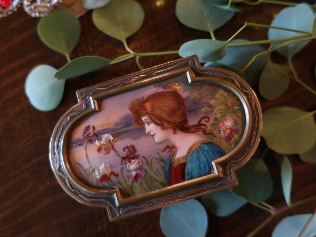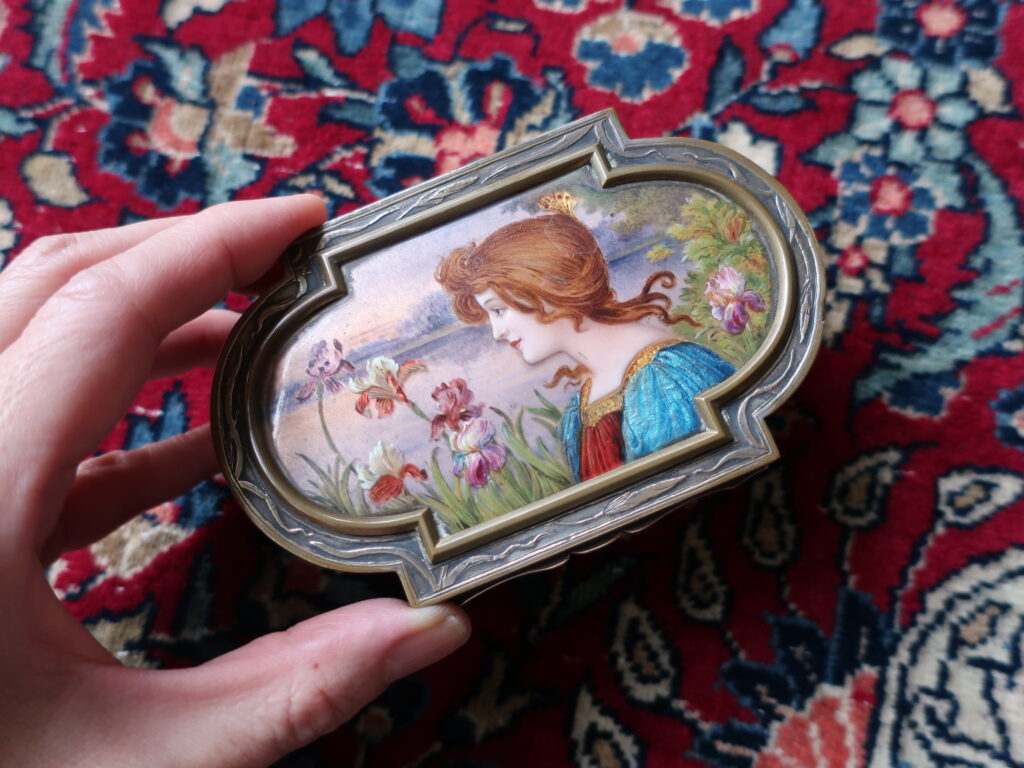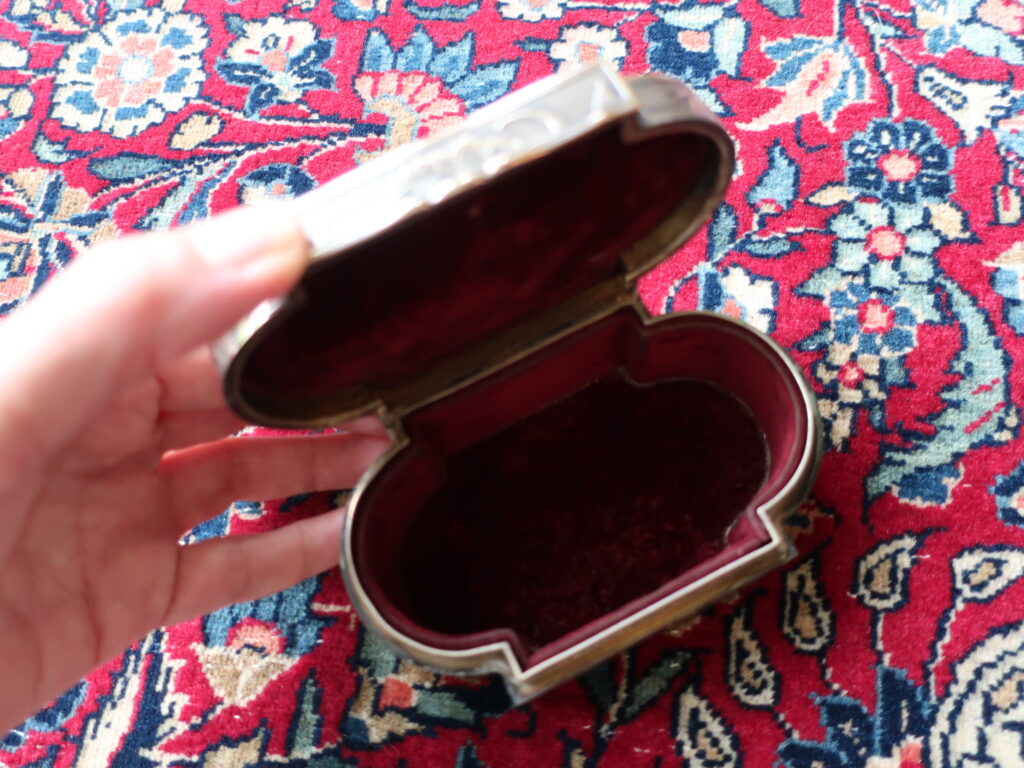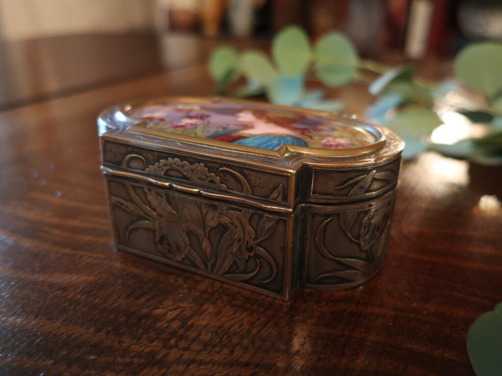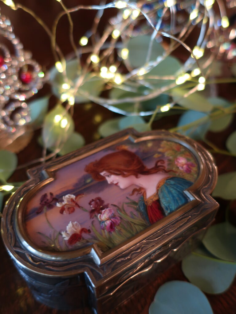 エナメルの絵画が嵌めこまれたシルバー製のジュエリーボックスです。アールデコよりアールヌーボーのアンティークに興味があったときフランスで求めたもの。思い出すと幼いころ綺麗なお菓子の缶をいつまでも大切にしていたように、箱ものには心を惹きつける魅力があるようです。