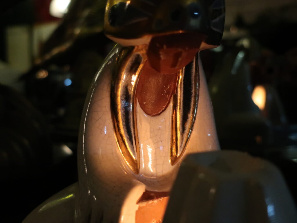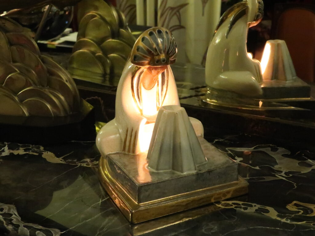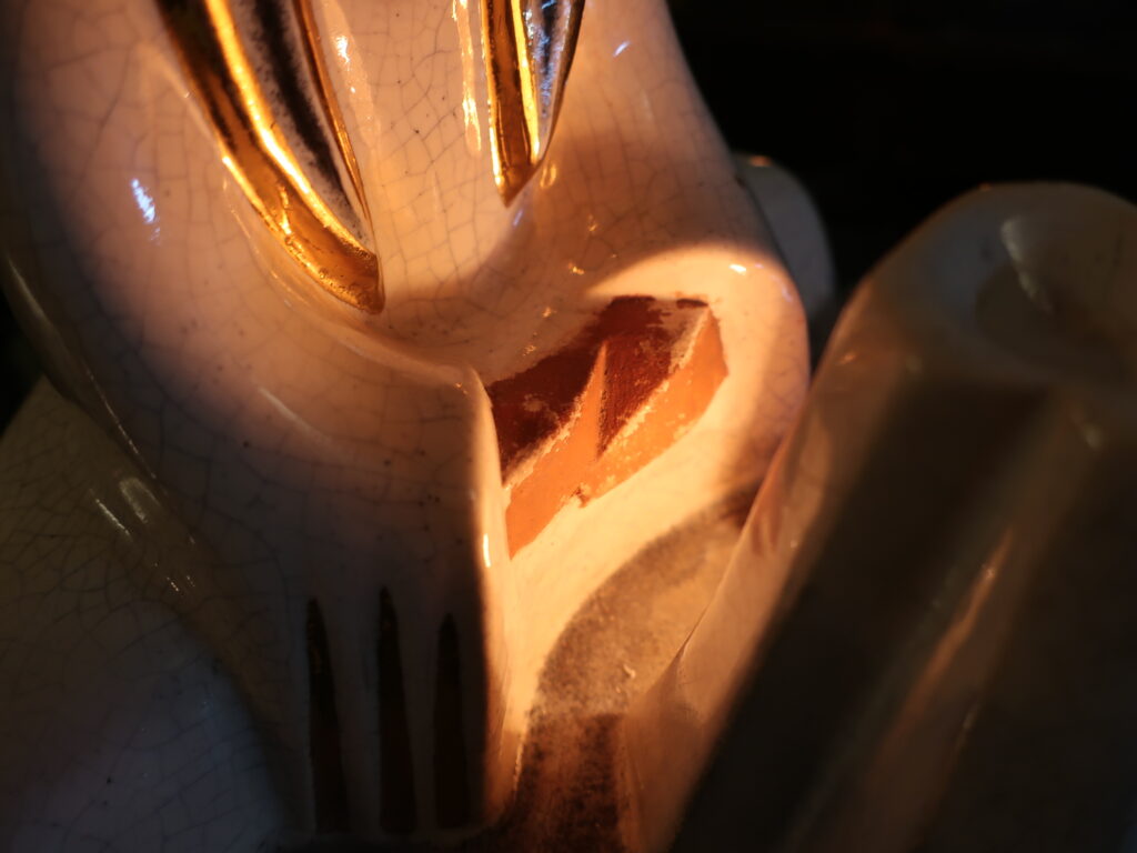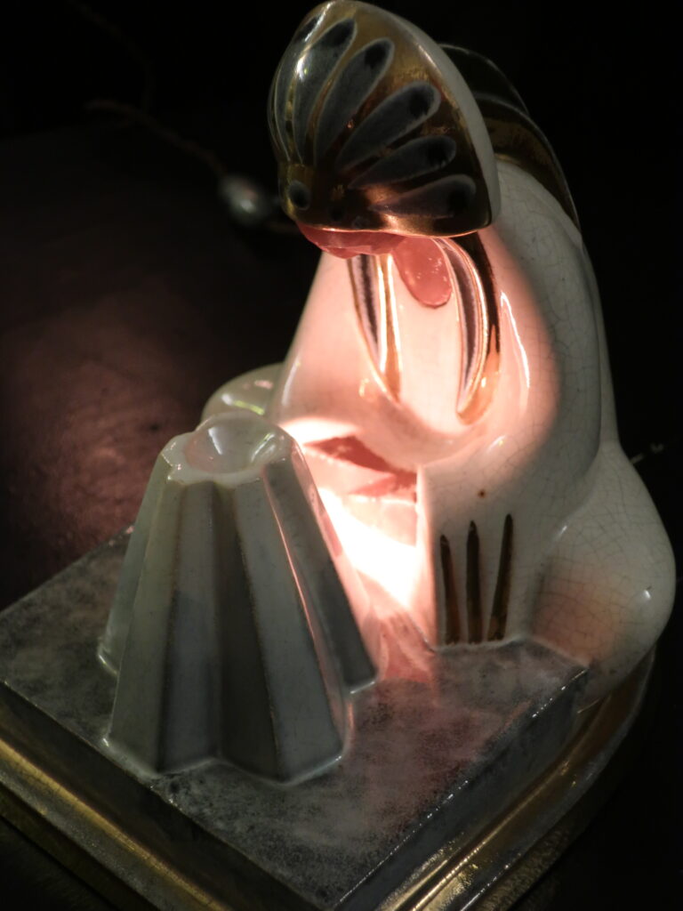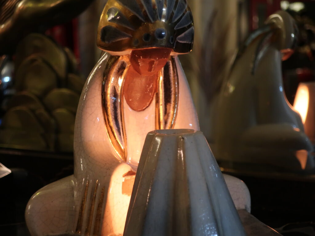 このインディアンはフィギュアの中に電球が仕込まれ、白い磁器の胎自体が灯る今まで紹介したRobjのパフュームランプとは少し違います。山型に形作られた焚火のモチーフの中で灯る電球。その灯りがインディアンのボディに反射をし輝く仕組み。鮮やかに輝く金彩の頭飾り、炎に照らされさらに赤く浮かび上がる褐色の肌。その様子を眺めていると自分も静かな時間が流れるその場の一部のような感覚に。