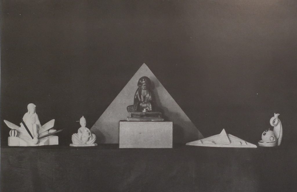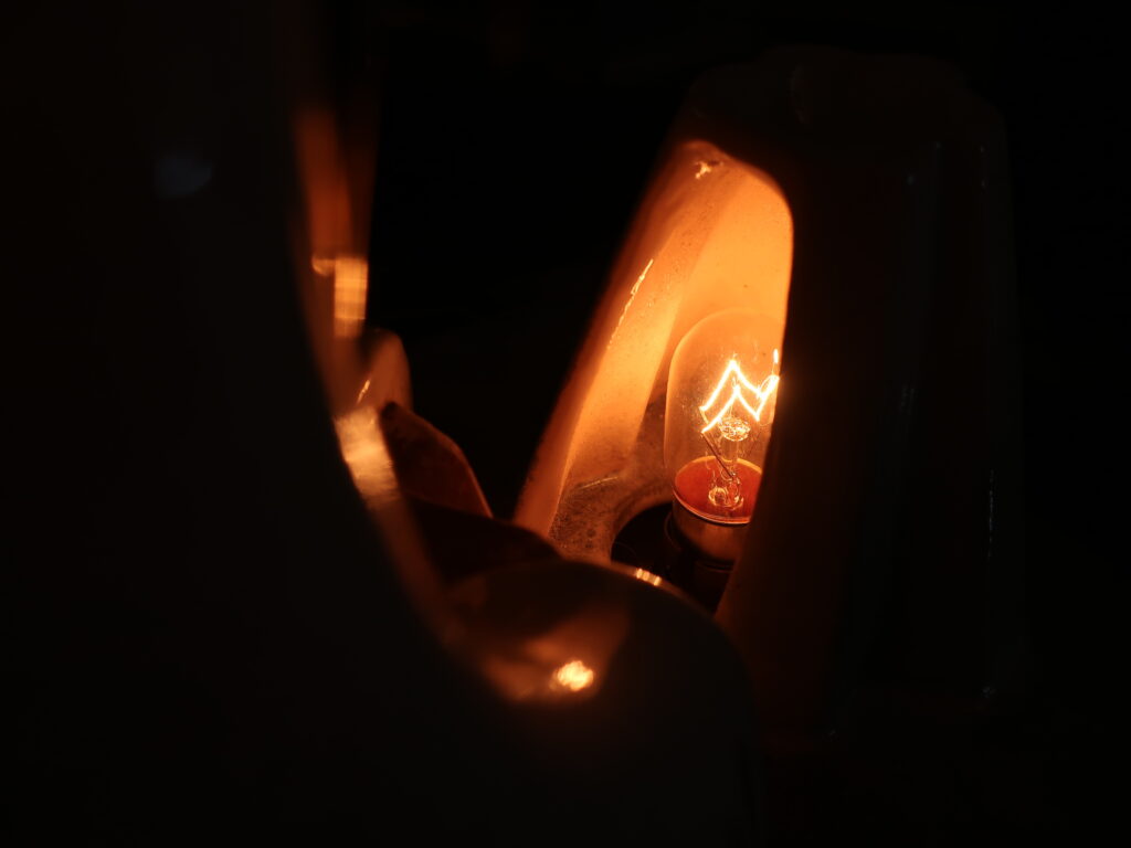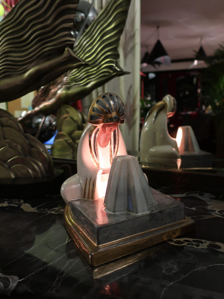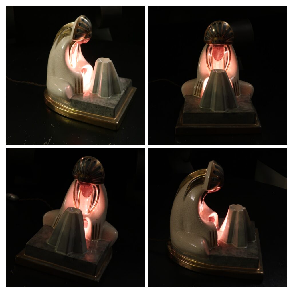 このインディアンはフィギュアの中に電球が仕込まれ、白い磁器の胎自体が灯る今まで紹介したRobjのパフュームランプとは少し違います。山型に形作られた焚火のモチーフの中で灯る電球。その灯りがインディアンのボディに反射をし輝く仕組み。鮮やかに輝く金彩の頭飾り、炎に照らされさらに赤く浮かび上がる褐色の肌。その様子を眺めていると自分も静かな時間が流れるその場の一部のような感覚に。