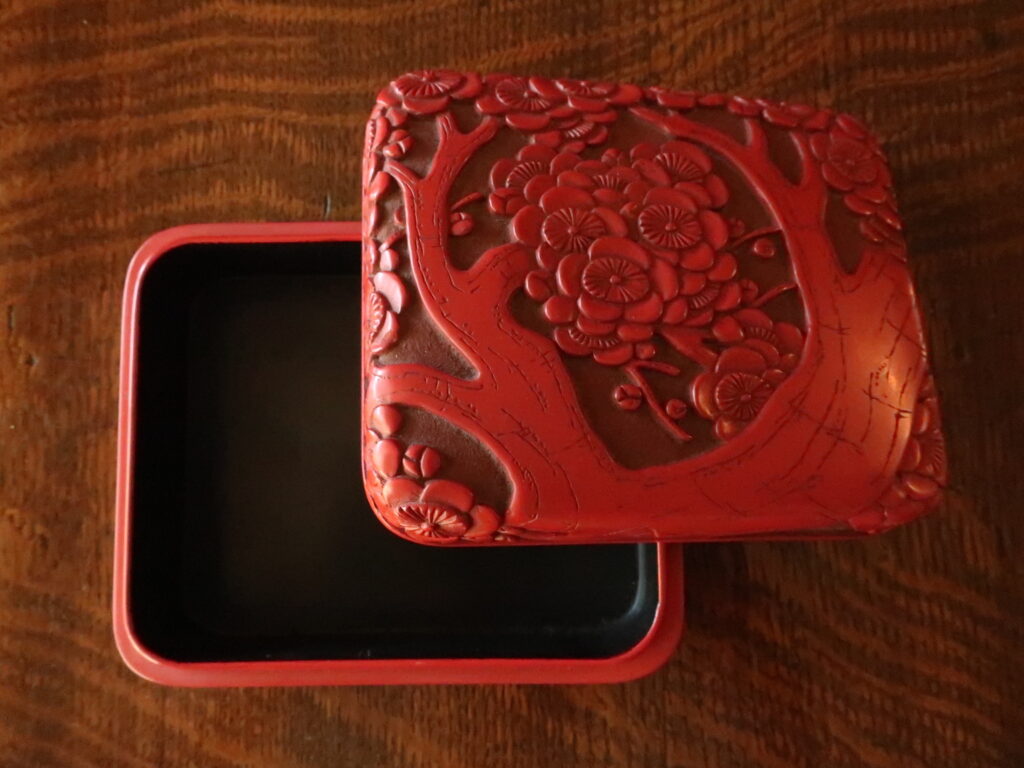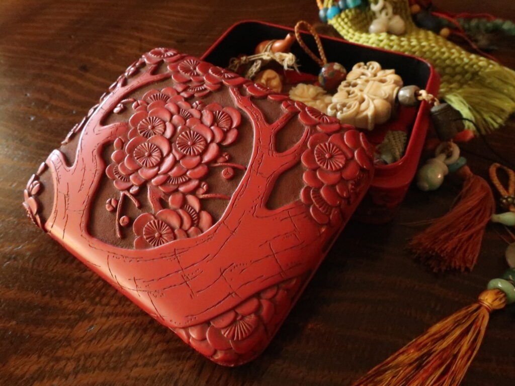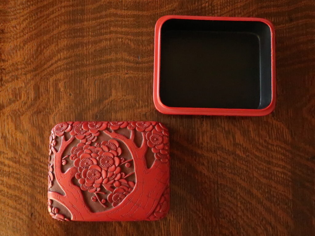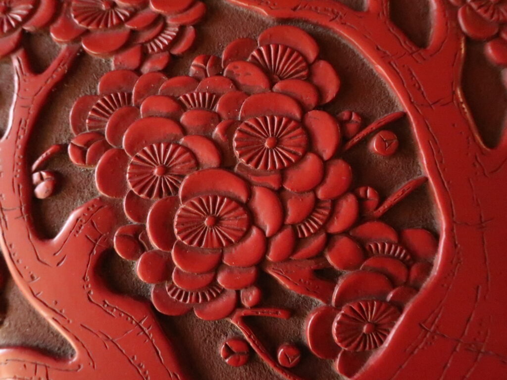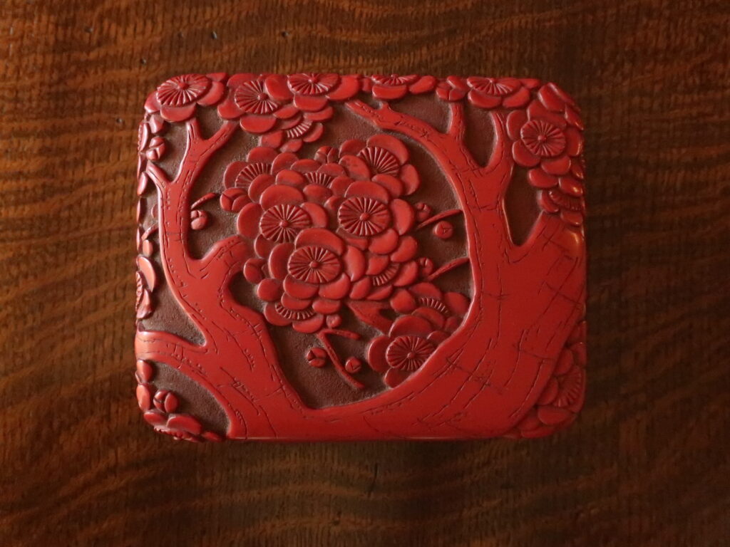 ずっと以前京都で求めた堆朱の小箱です。重なり合う梅の花が深く複雑な彫刻で際立つちます。通常の漆塗りは数層から十数層程度ですが、堆朱の場合は漆を100層以上を重ねることもあり、その厚さは数ミリから1センチ近くに達するそうです。そこに続いて彫刻の作業。