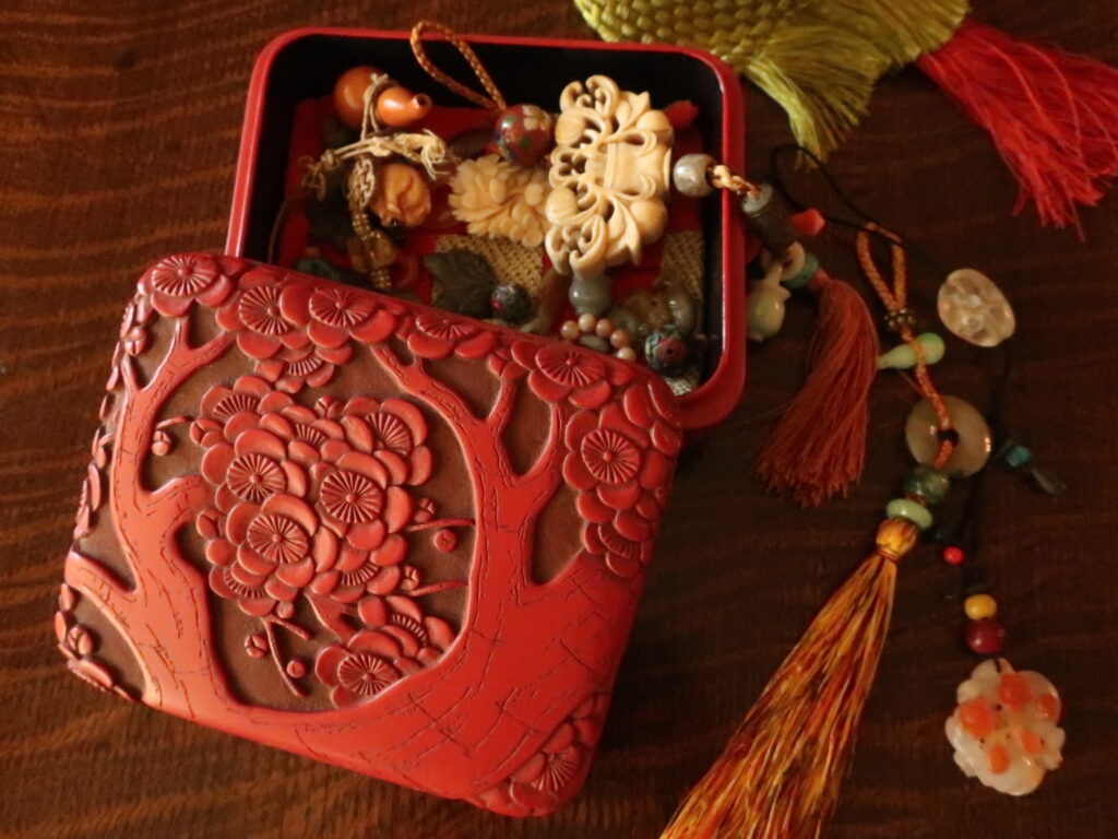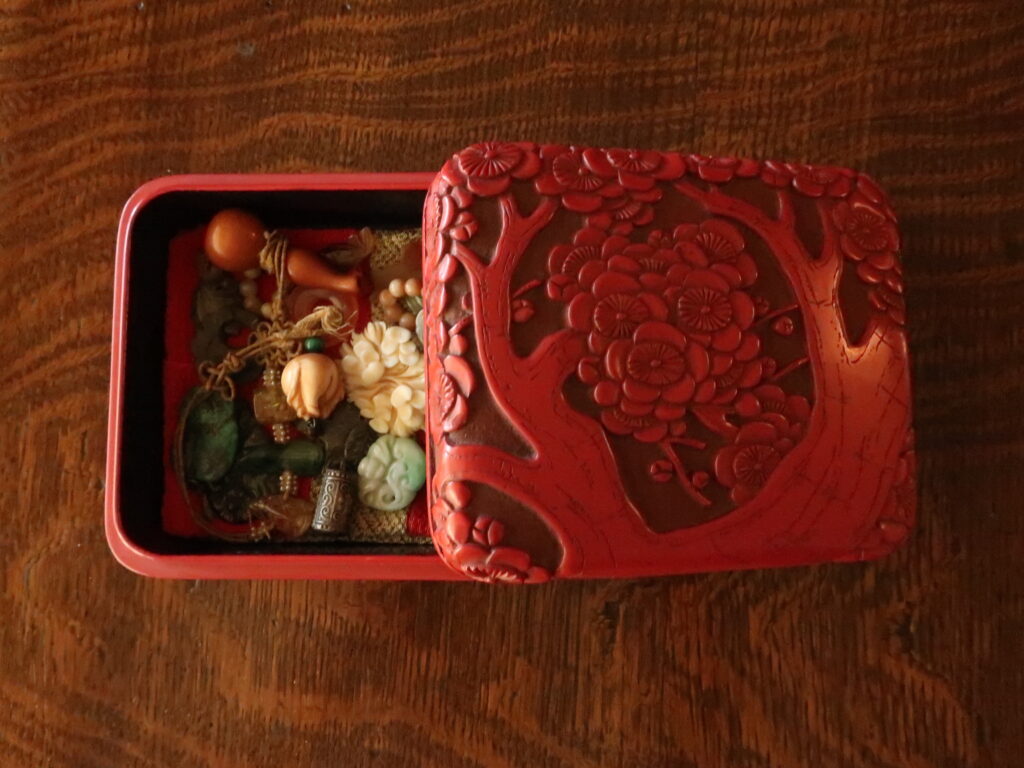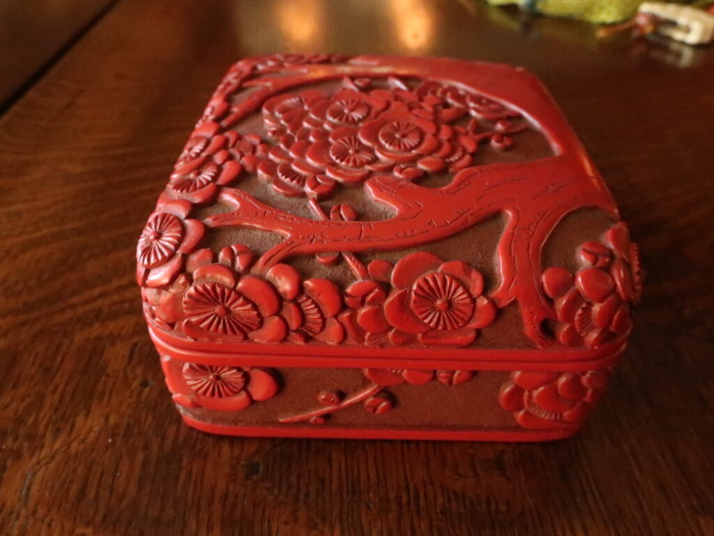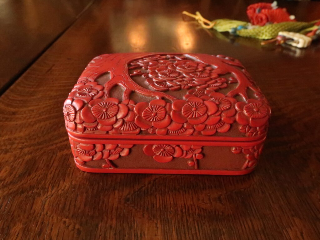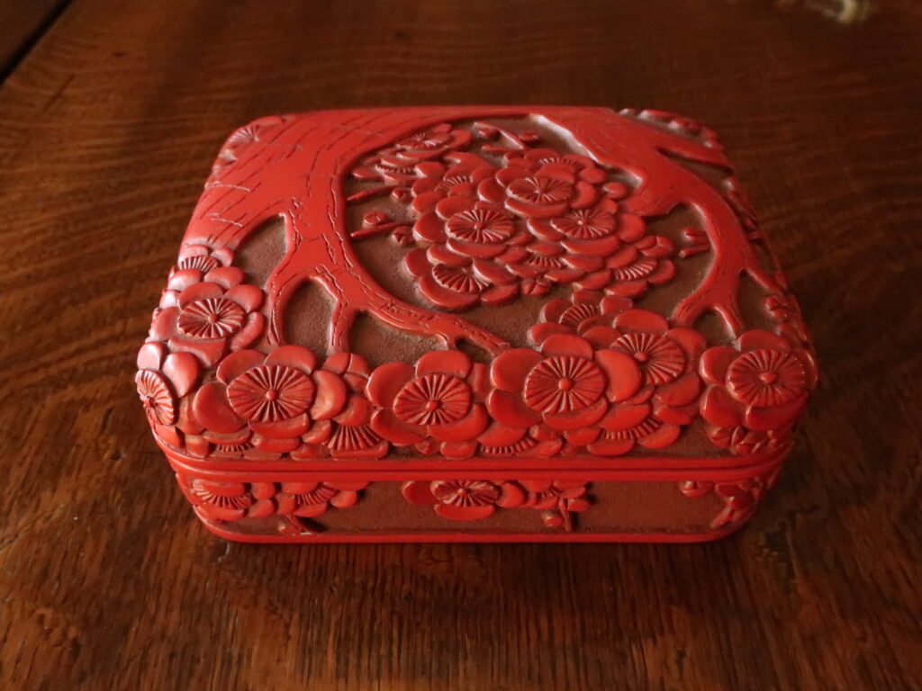 ずっと以前京都で求めた堆朱の小箱です。重なり合う梅の花が深く複雑な彫刻で際立つちます。通常の漆塗りは数層から十数層程度ですが、堆朱の場合は漆を100層以上を重ねることもあり、その厚さは数ミリから1センチ近くに達するそうです。そこに続いて彫刻の作業。