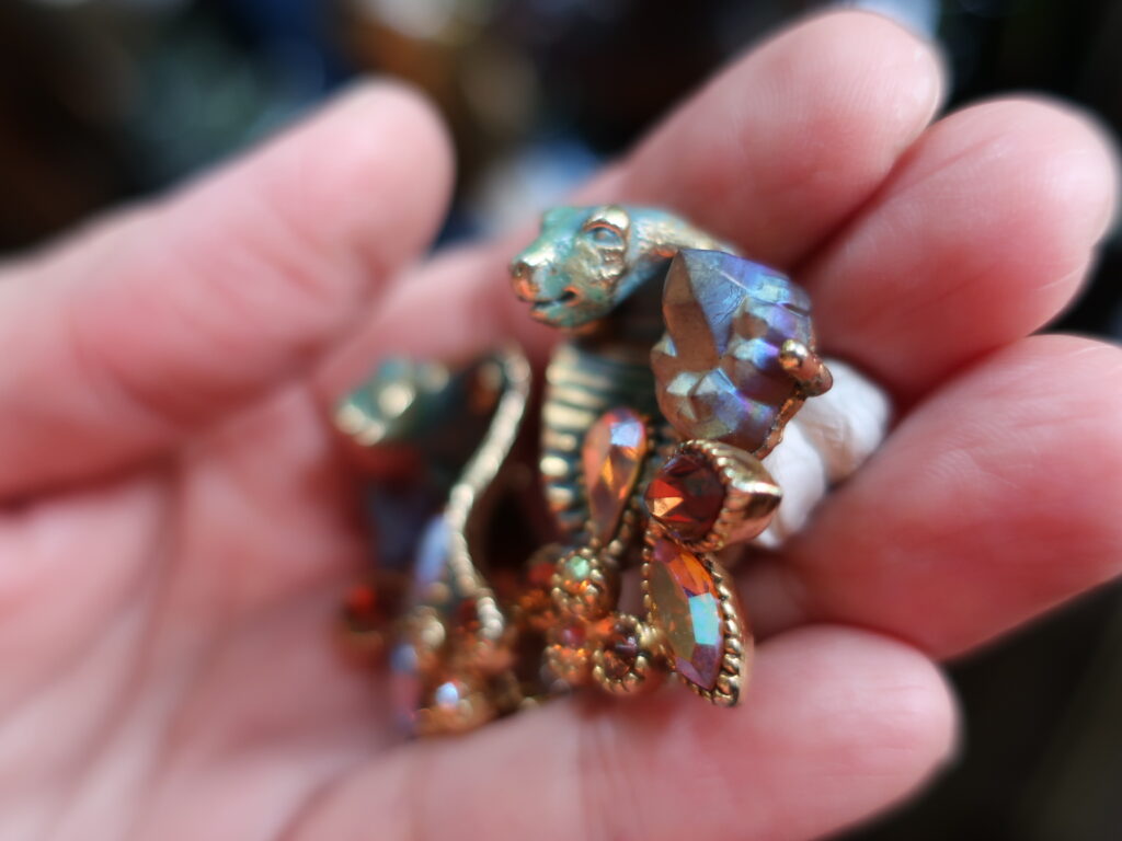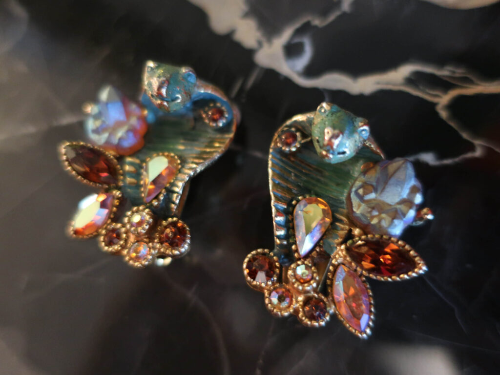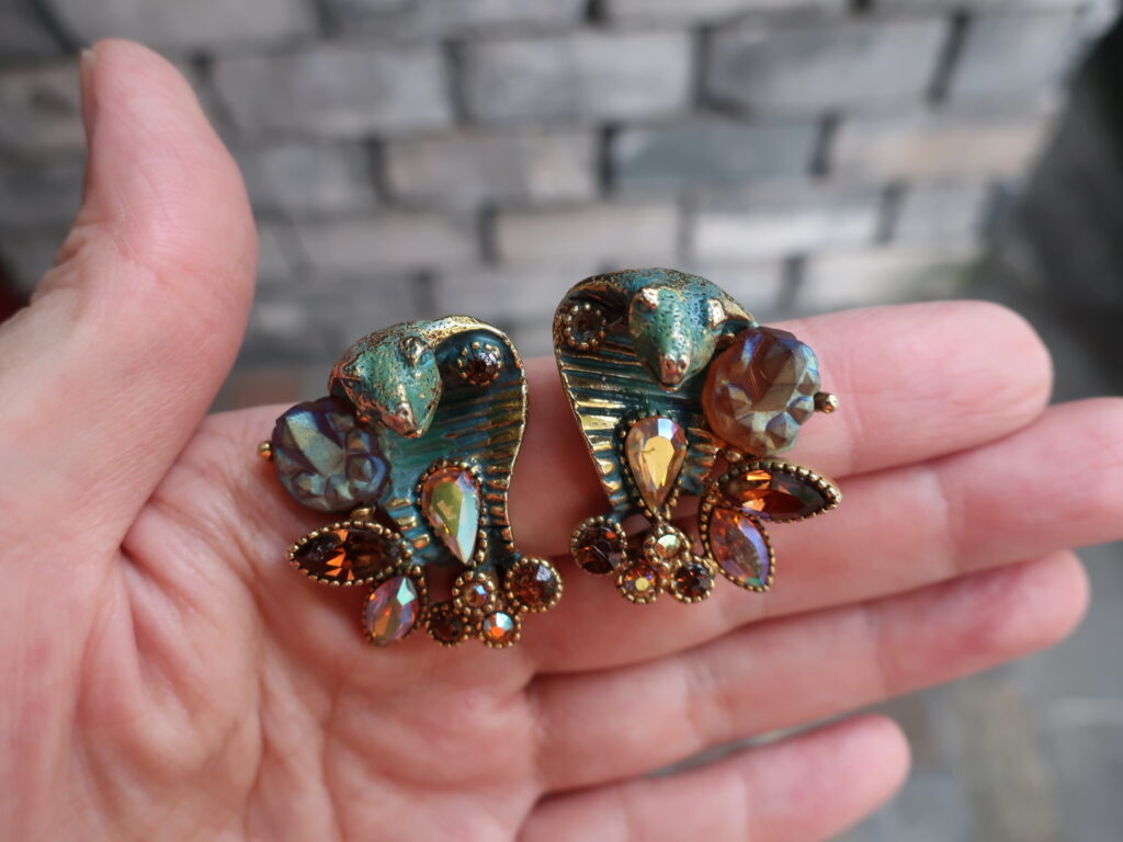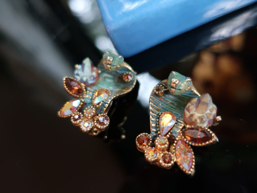 アンティークゴールド色のベースに緑錆をふかせたような粉っぽいグリーンの彩色。そして洞窟の中の水晶のような形に作られたガラスは見る角度によって色を変えミステリアス、アンバー色のラインストーンも全体の雰囲気に合っていて見どころたっぷりのイヤリングでした。