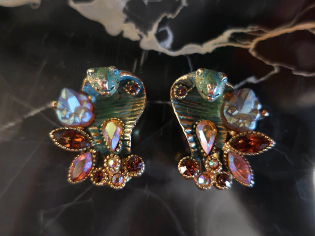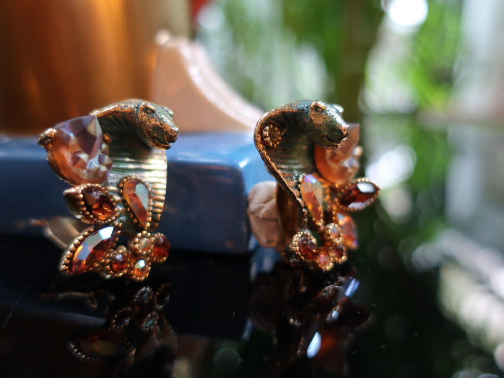 HARのコブラのイヤリング。1959年に発表された「ファンタジー・コレクション」というシリーズの中の一品でネックレス、ブレスレット、イヤリング、ブローチがつくられていたようです。ジュエリーのデザインに蛇のモチーフは多々ありますが、このHARのコブラはその表情が優しく魅力的でずっと実物を見てみたいと思っていたもの。