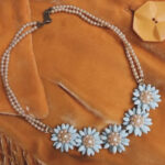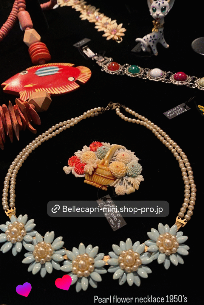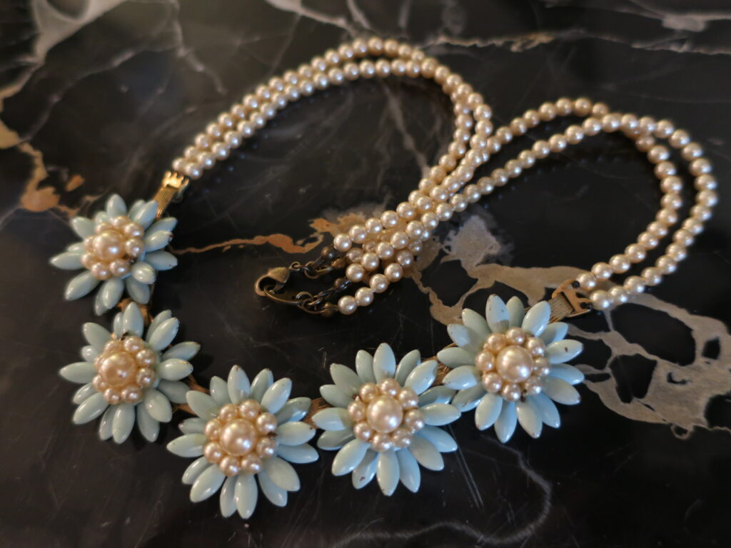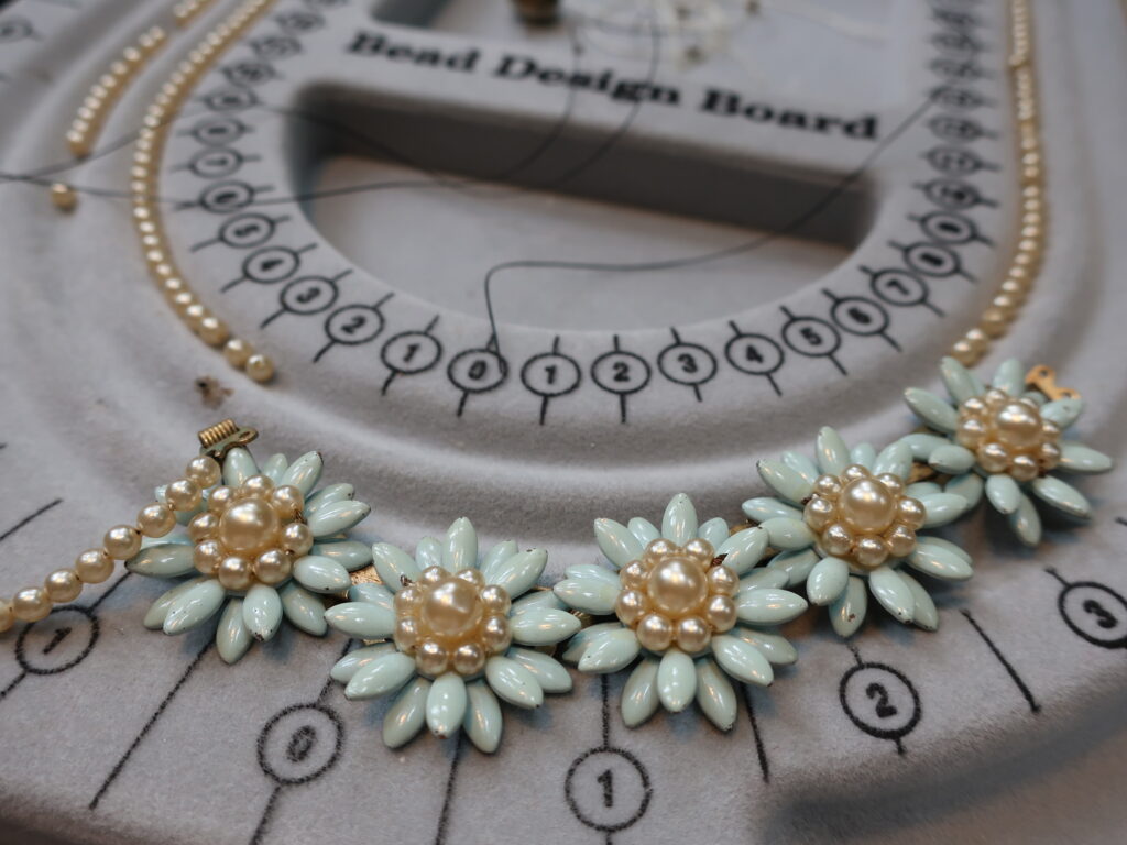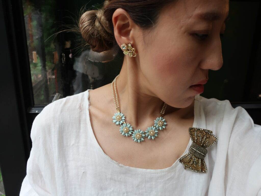 ネックレスを今回のセールでご覧いただくことが多く、そうか!と思い一念発起。きれいなネックレスが眠ったままなのを思い出しメンテナンスをすることにしました。ミッションは伸びてしまった糸替え、明るいところで見ると経年によるよこれが見えてきたので花びら部分の掃除、そして動作不良の金具をどうするか。