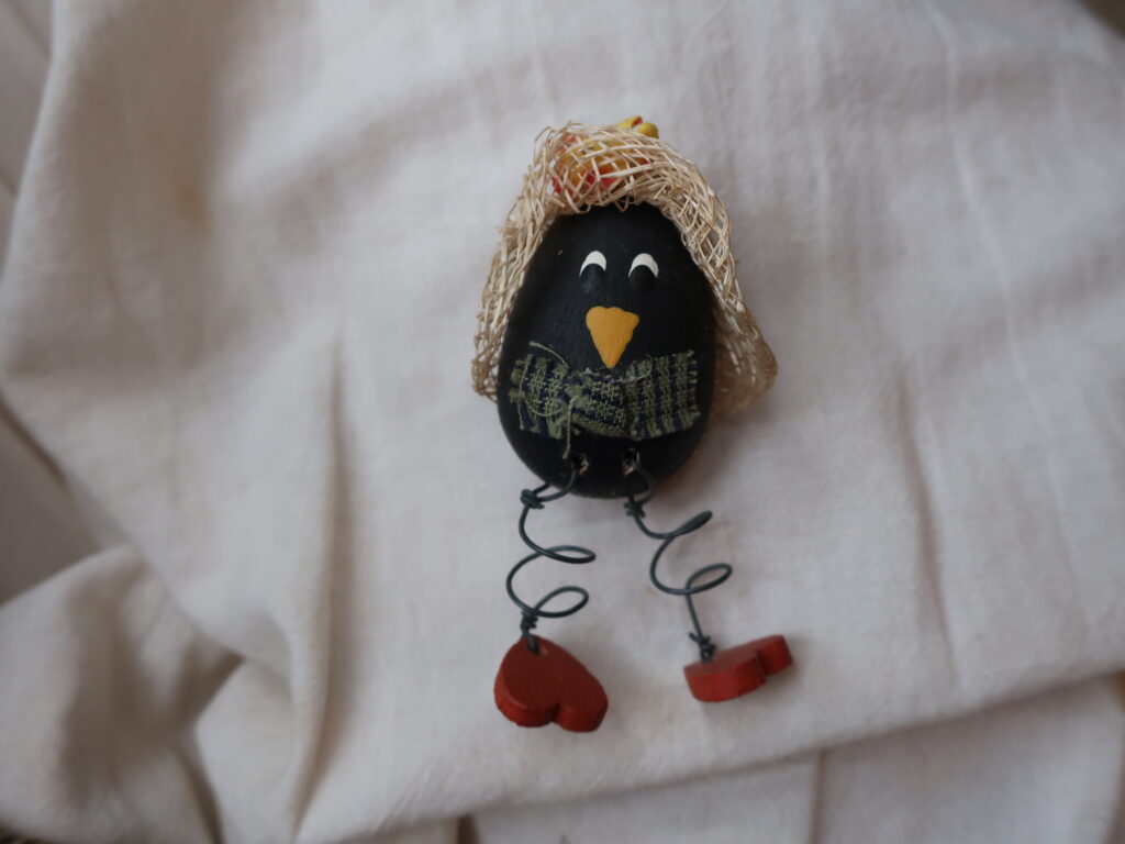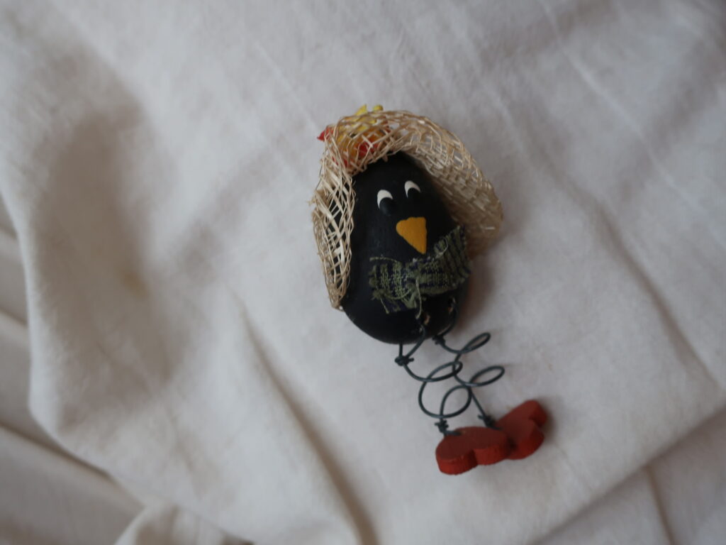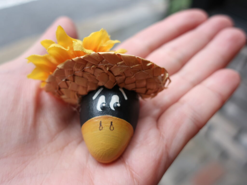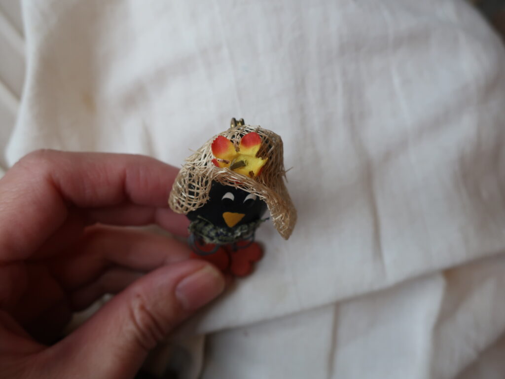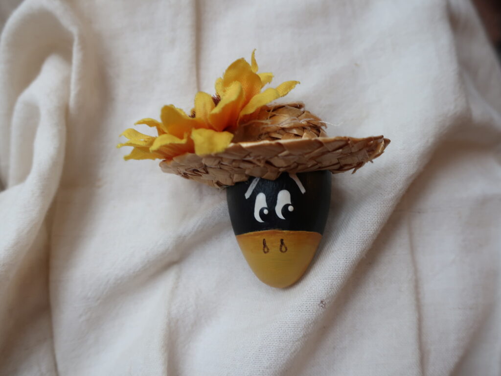 ヒマワリの中心の茶色いふさふさが柔らかくて触ると気持ちがいいです。ヒマワリ帽子のカラス 5.7×6㎝