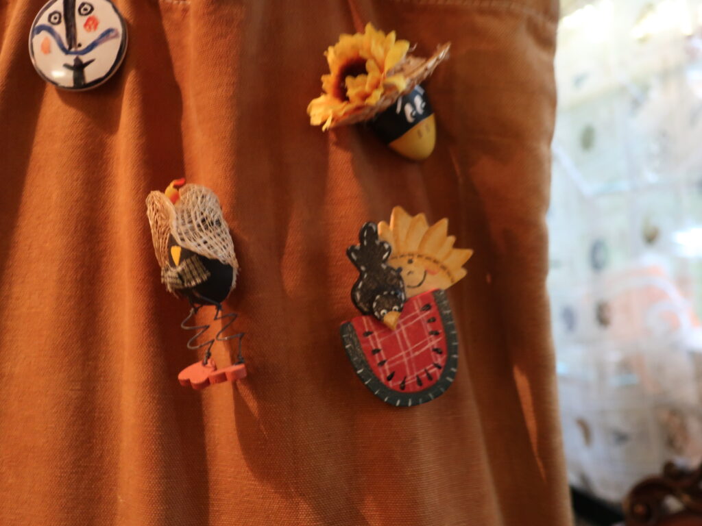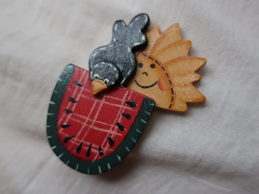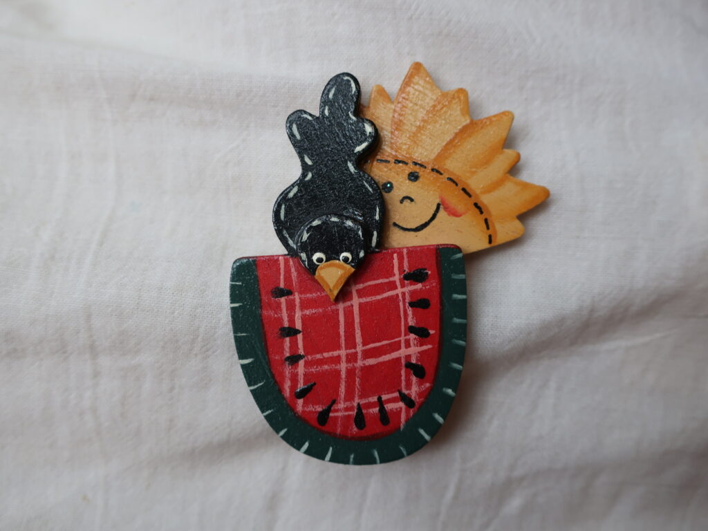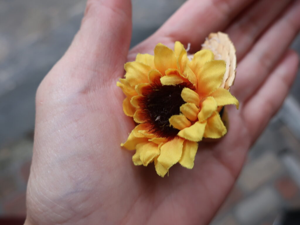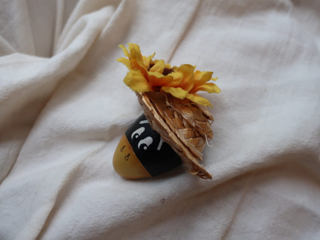 ヒマワリの中心の茶色いふさふさが柔らかくて触ると気持ちがいいです。ヒマワリ帽子のカラス 5.7×6㎝