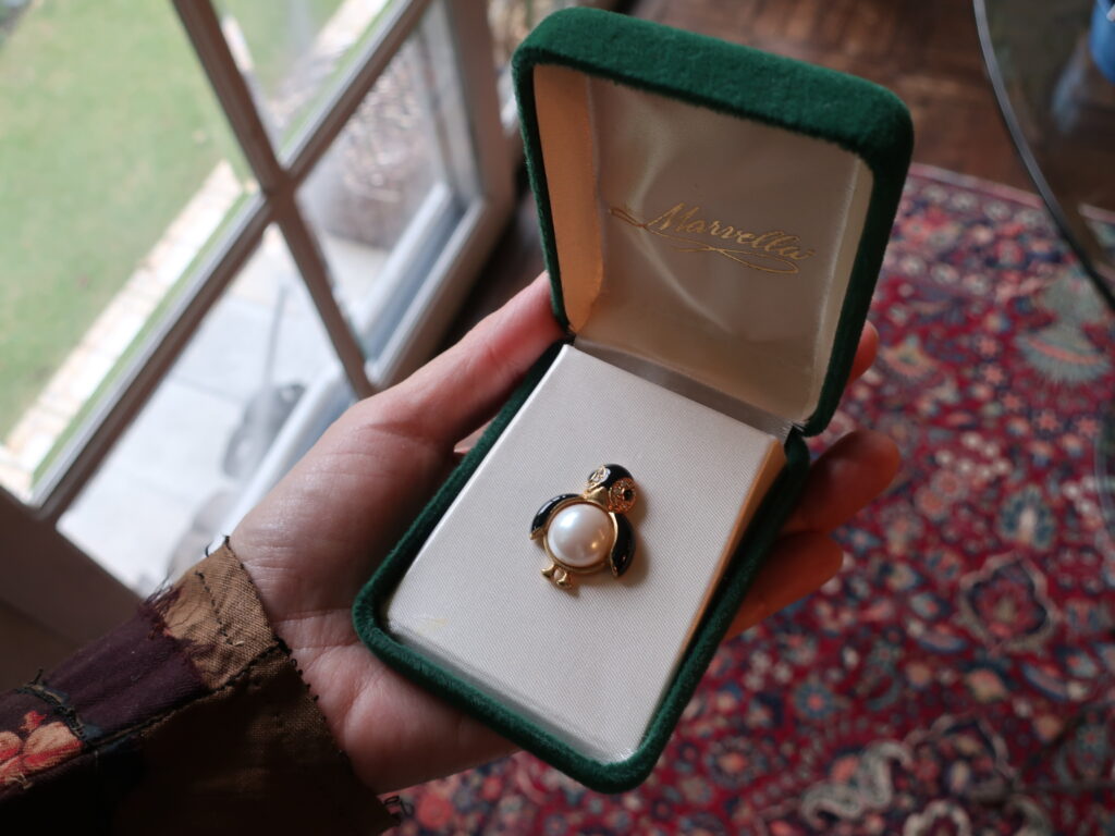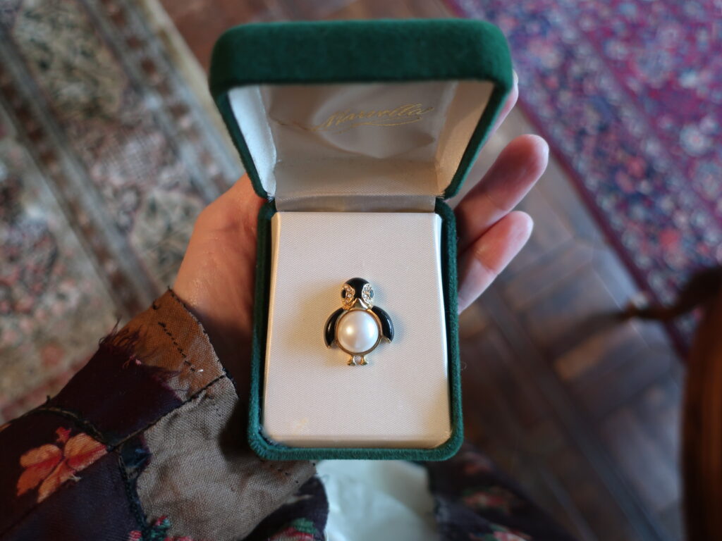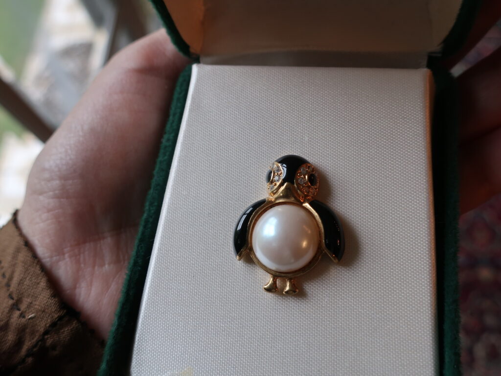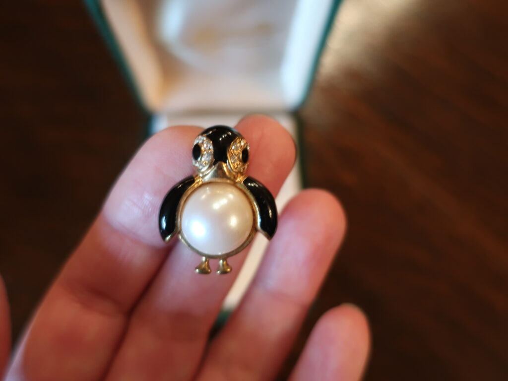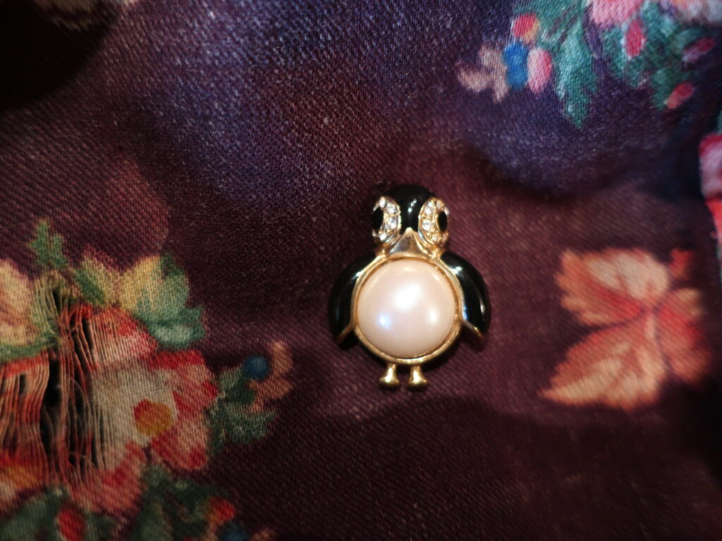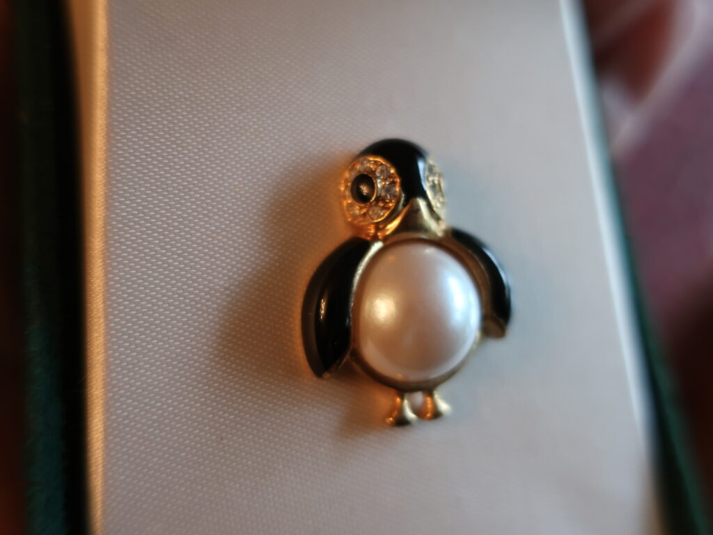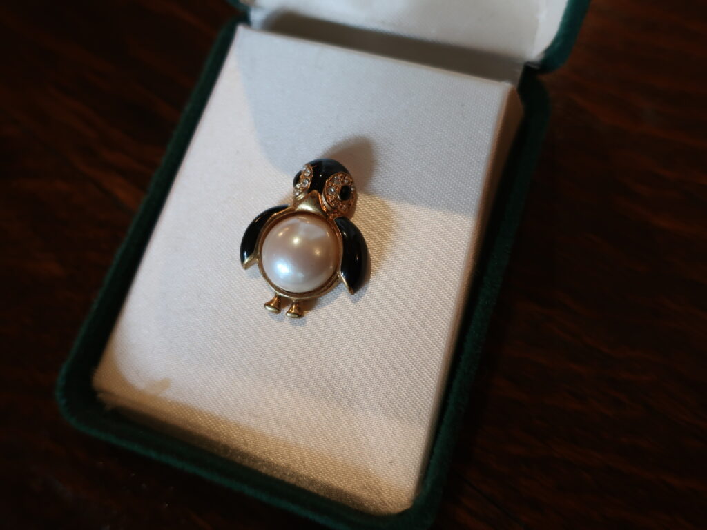というわけでいろいろ長くなりましたがマーヴェラのペンギンブローチはオリジナルのジュエリーボックスとともに登場します。小ぶりですがおなかのパールが印象的で厚手のコートの襟につけても負けないと思います。どしっと構えたペンギンくん、どうぞよろしくお願いします。あっ、ちょんっとした脚もかわいいのでご注目を。