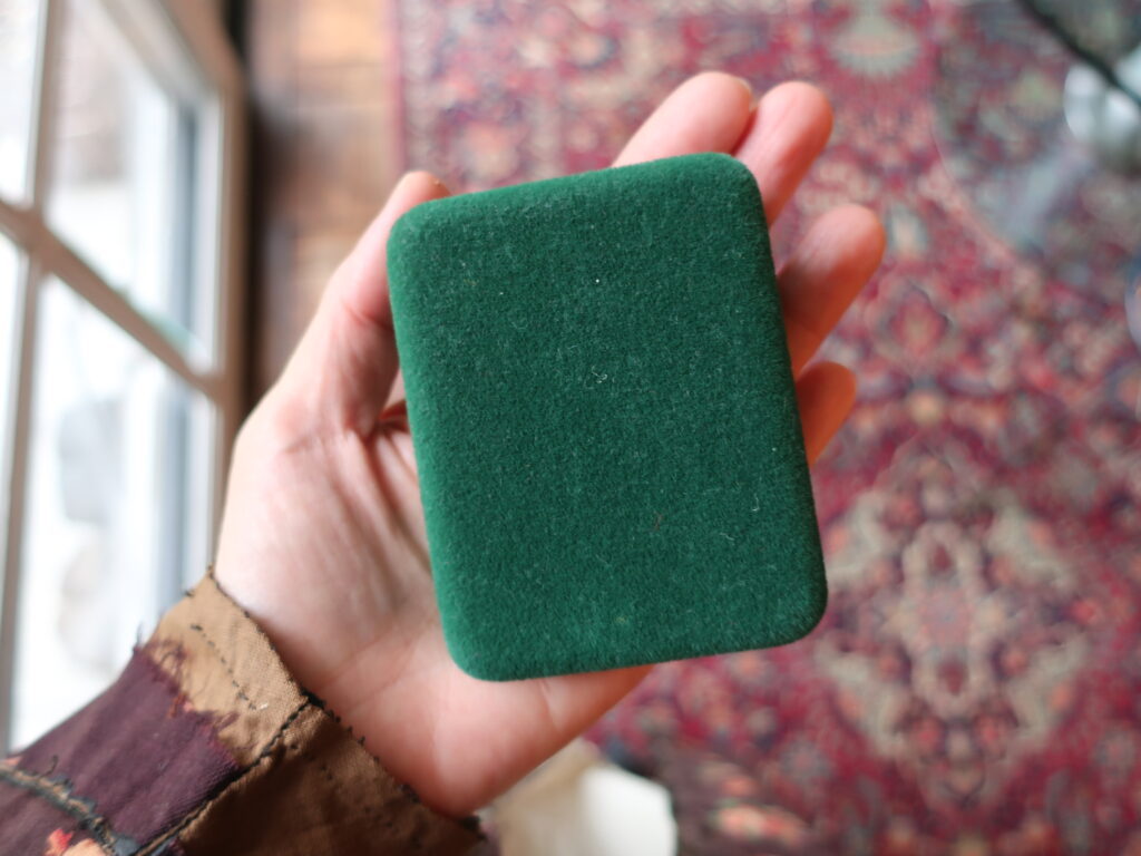 ちょっと立派なグリーンのジュエリーボックス。パカッと開けると出ました!