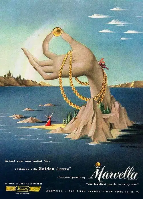 ちなみに1911年にスタートしたマーヴェラですが1950年代フェイクパールのコスチュームジュエリーを多く製作。そして1982年にトリファリに買収されます。下のイラストは1948年の広告。個性的なイラストに目がいきますが書かれた文字を見てみると