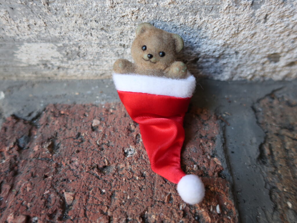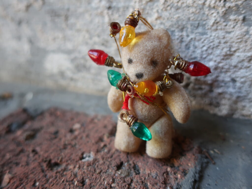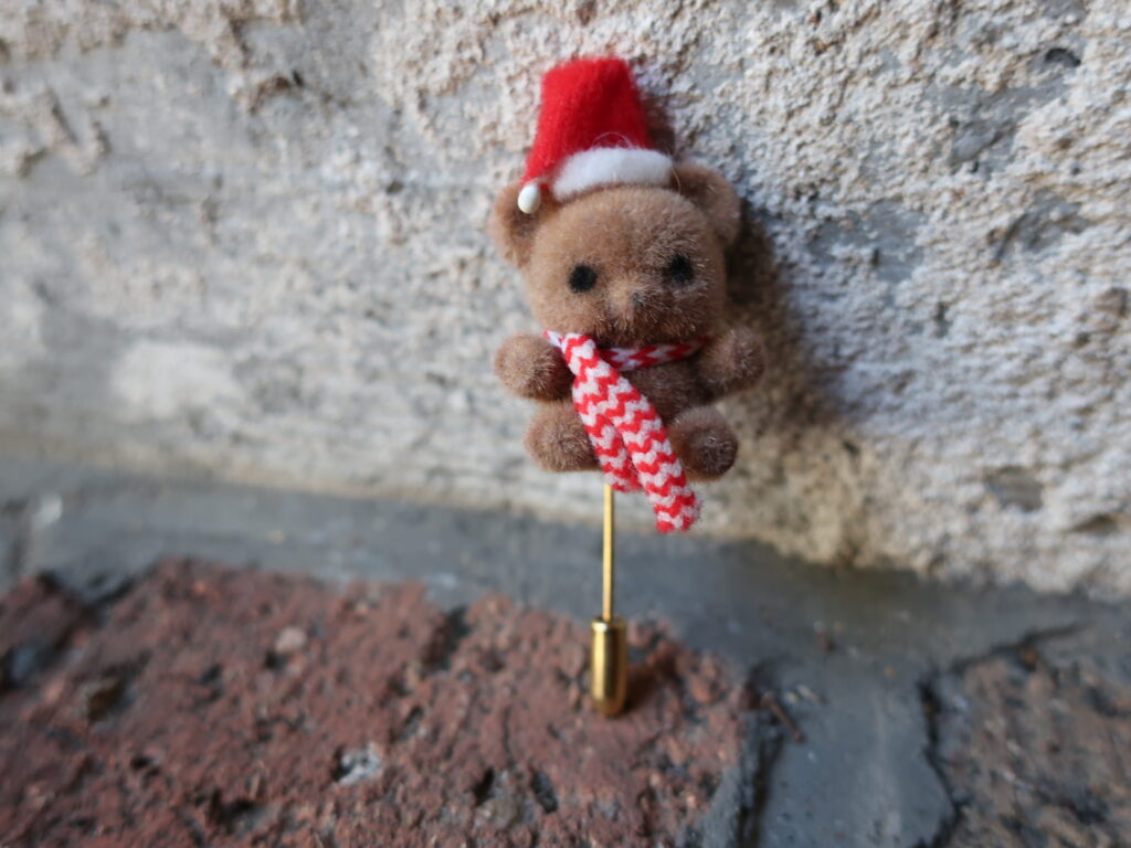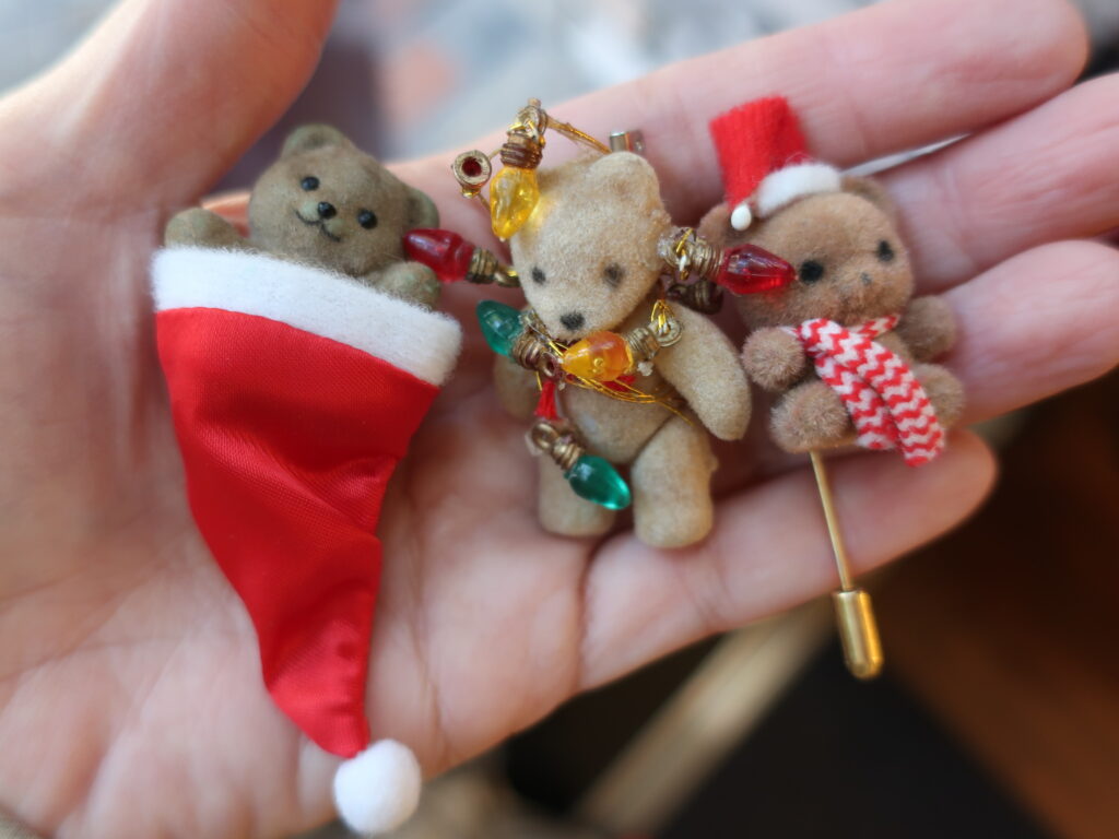 おもちゃみたいなブローチもこの季節なら楽しくつけられます。ちょっとえりにつけたりすれば「なにそれ~。」と楽しく会話も弾みます。体にイルミネーションが絡まってしまったクマに、帽子に入ったクマ、マフラーをしたクマ。それぞれちょっとふわふわの起毛でマスコットのよう。