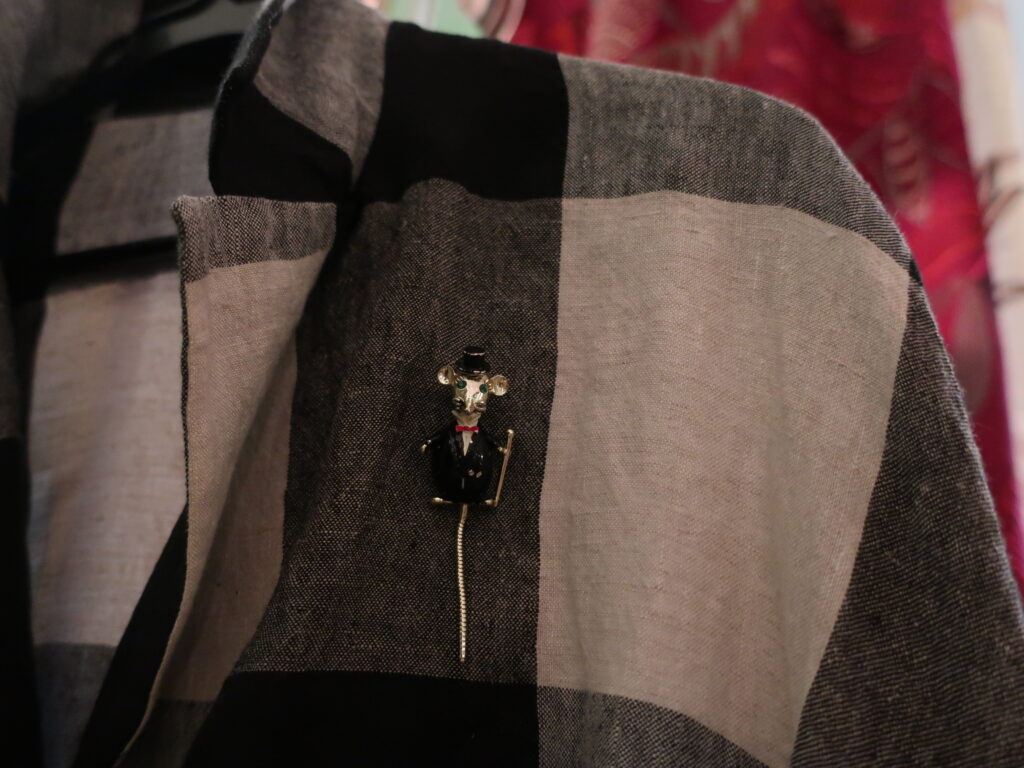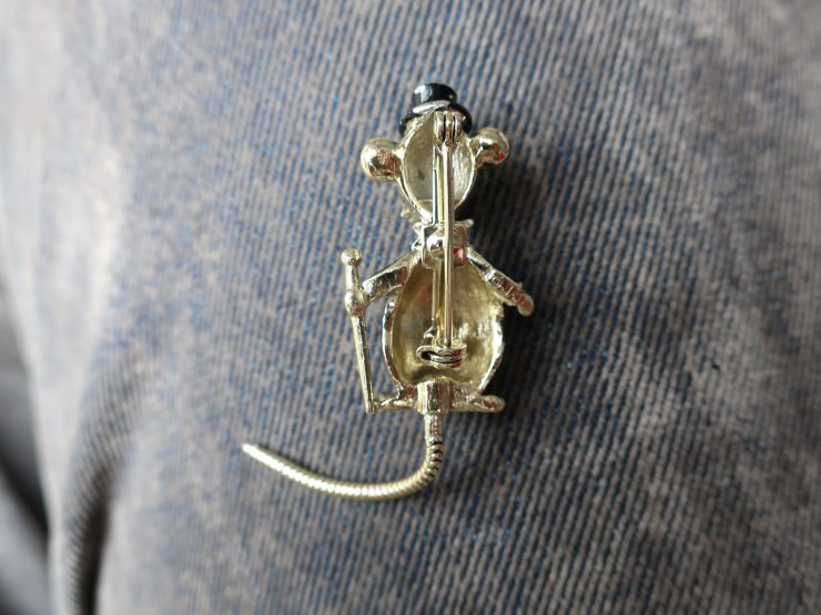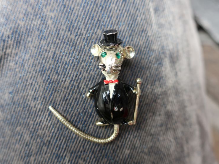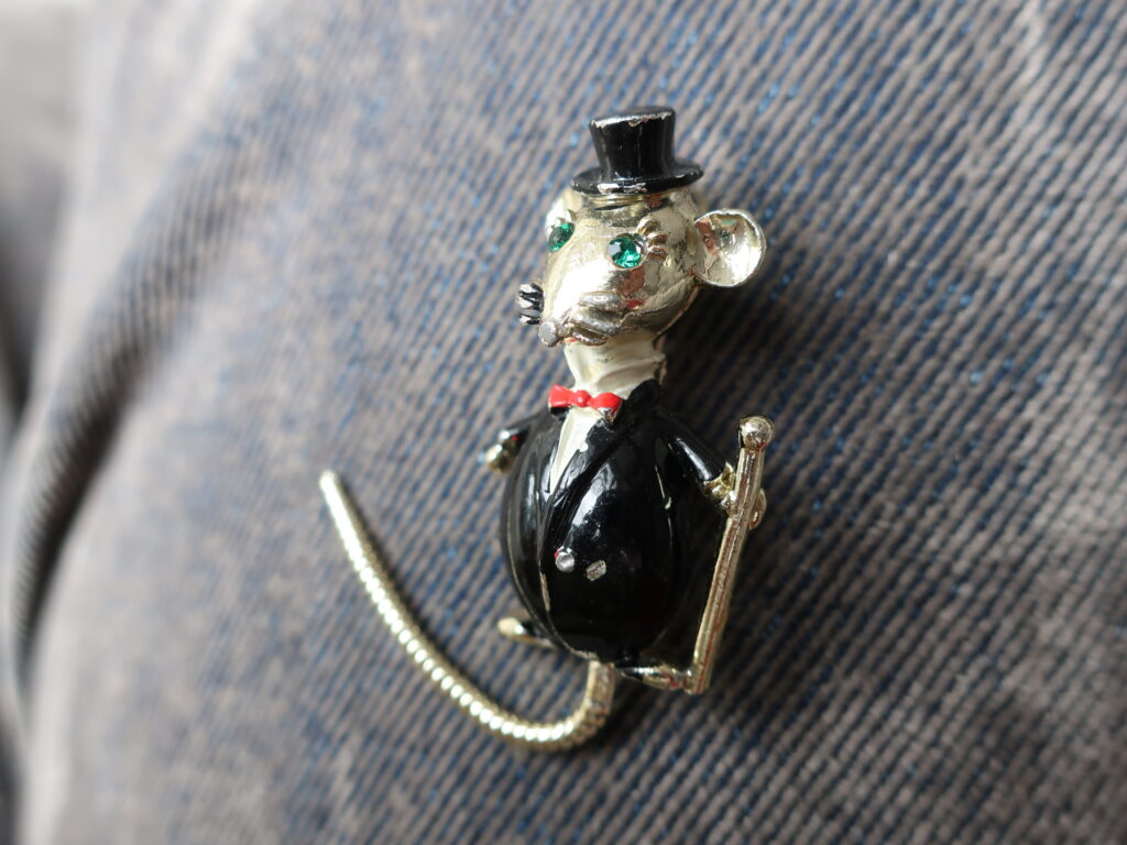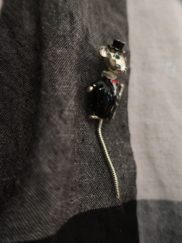 このネズミのブローチ、ほかに猫のデザインがあり、赤いものを私物として持っているのですが色のせいかホテルの従業員のように見えます。この黒いタキシードのねずみは貫禄がある紳士に見え良い感じです。横からの姿もかわいいので是非写真でご覧ください。オンラインショップJJのカテゴリにもこれから掲載予定です