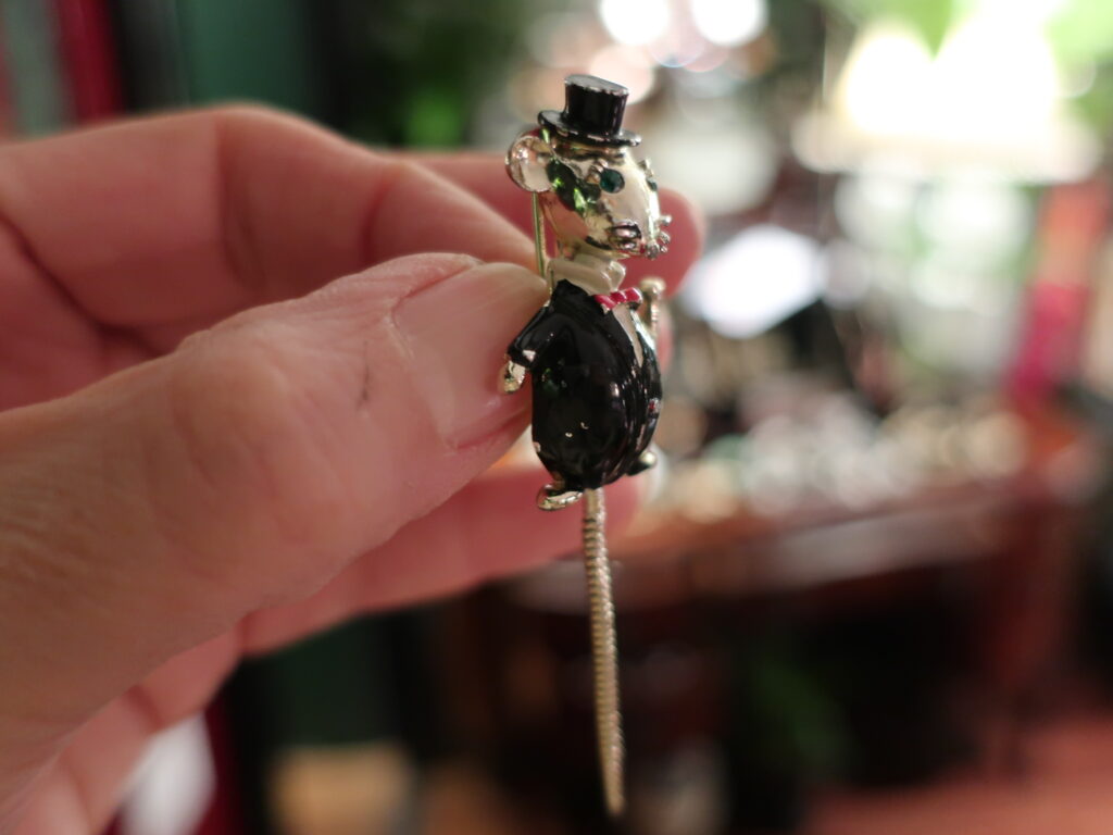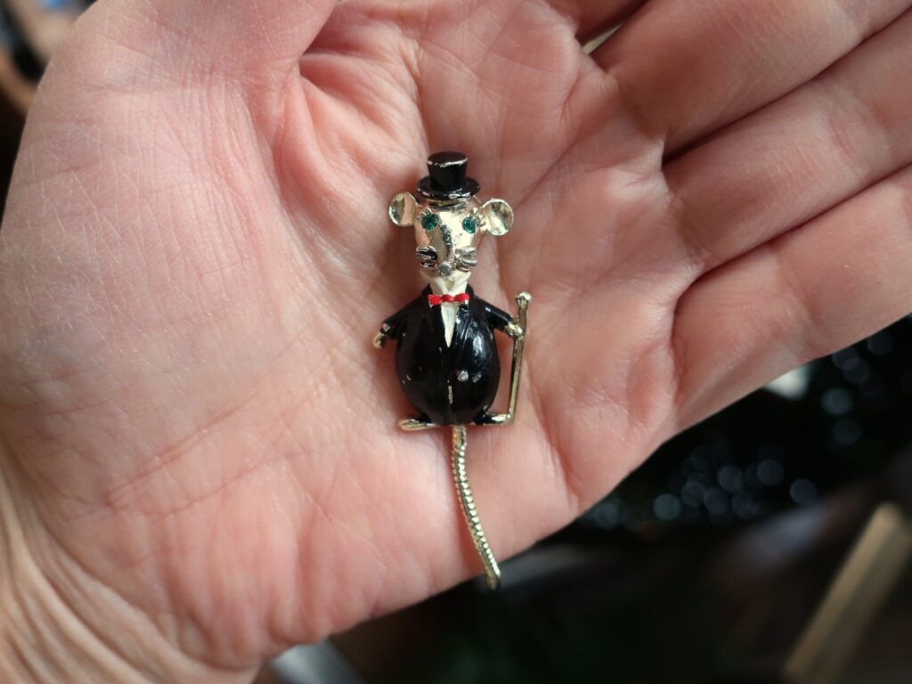 先週は金、土曜とお休みをいただきました。また本日から通常営業スタートです。どうぞよろしくお願いいたします。先ほどポストに届いた1960年代製JJの紳士なネズミのブローチがとてもかわいいかったので急いで写真を撮りました!ポッコリお腹、ゆれる尻尾(見た目がリアル(笑))シルクハットにステッキ、タキシードとばっちり決まったねずみです。