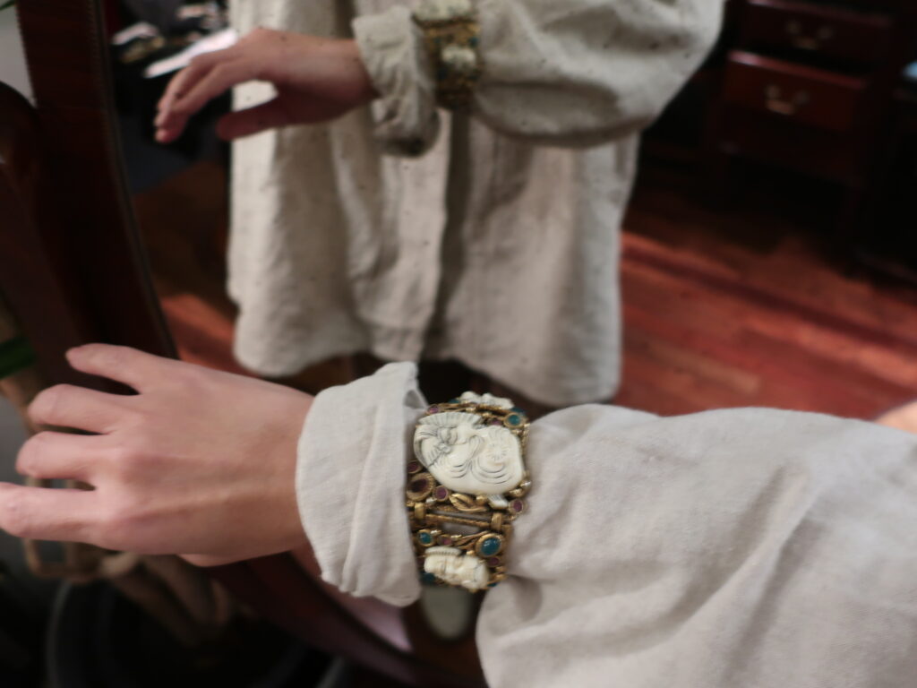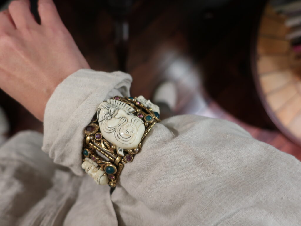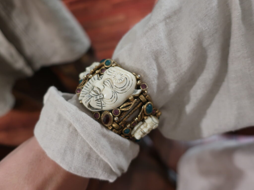 節分ということでお店に鬼がいたかな?と探しましたがいませんでした。でも鬼に近いかなと思いselro社のDevils face(Devil Mask)呼ばれているらしいブレスレットをご紹介します。オリエンタルなモチーフのカボションを使ってとても個性的なジュエリーを作っていたselro社ですが、私が初めて見たselroのジュエリーがこのDevils face。翁の面をモチーフにした顔が並ぶこのシリーズはこちらのアイボリーカラーのほか、赤、ターコイズなど彩り豊富。ネックレス、イヤリング、ブローチ、ブレスレットなどバリエーションも様々。ベルカプリでもいくつかのデビルを送り出してきました。