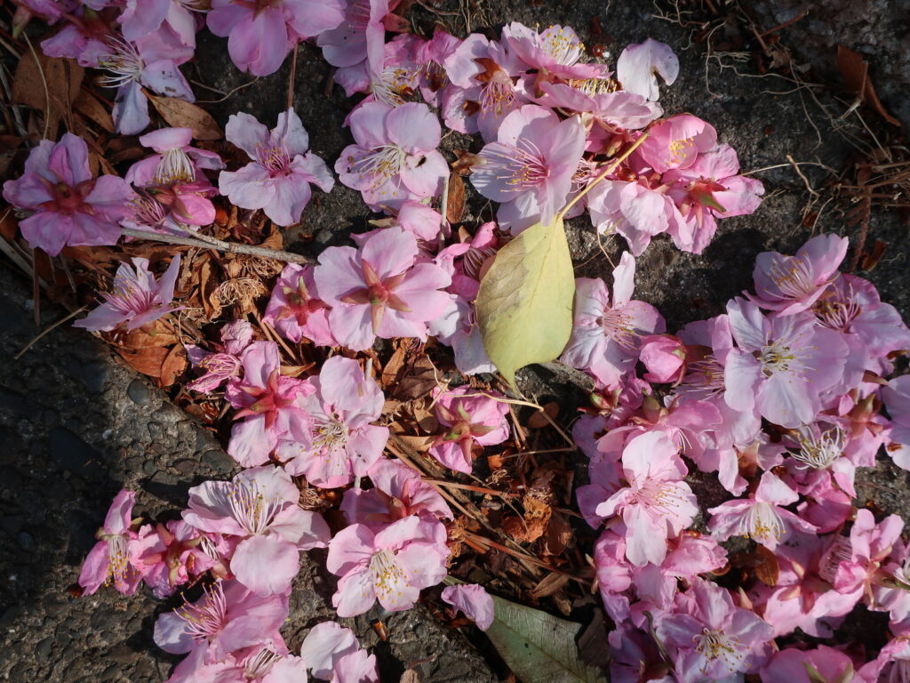 今週嬉しかったのはお店の斜め向かいのお宅の早咲きの桜のピンクがとても綺麗だったこと。石垣の上に咲く花も綺麗だったし、鳥がつまんで落ちた桜も道がピンク色になって綺麗でした。夕方には落ちた花びらがしおれて茶色っぽくなっていたのでお昼最高のタイミングで観賞できたようです。