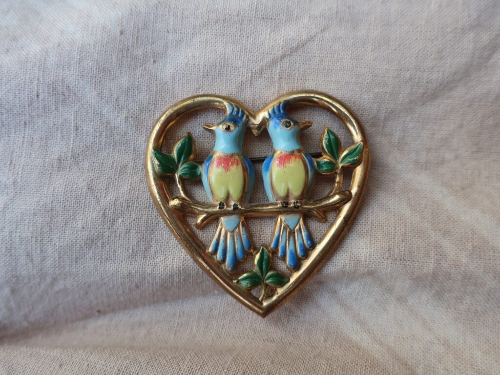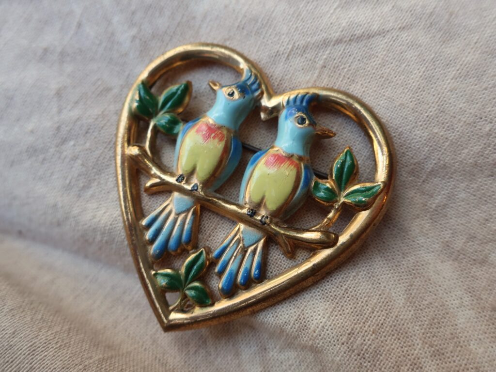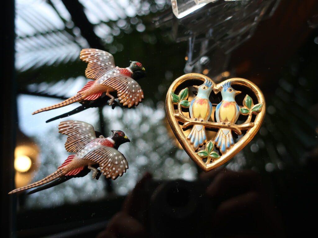 今日はお天気が良く暖かいせいかお店の前の坂の上の大きな欅の木の通りではうるさいくらいいろいろな小鳥の声が聞こえました。そんなちょっと春を感じる日にご紹介は鳥のブローチ。届きたて、古いプラスチック製の雉のブローチとCOROのLOVE Birdのブローチです。