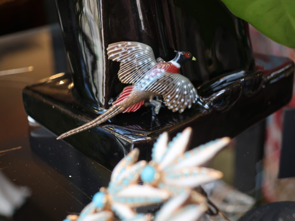 まずは雉のブローチを。雉と言えば私は桃太郎がすぐに頭に浮かびます。そして桃→ピンク→春という具合にイメージが湧きます。1960年代前後のプラスチック製です。使われていないデッドストックのもので色も才一も美しい状態です。長い尾羽が繊細なのでどうぞ注意をしてお取り扱いください。