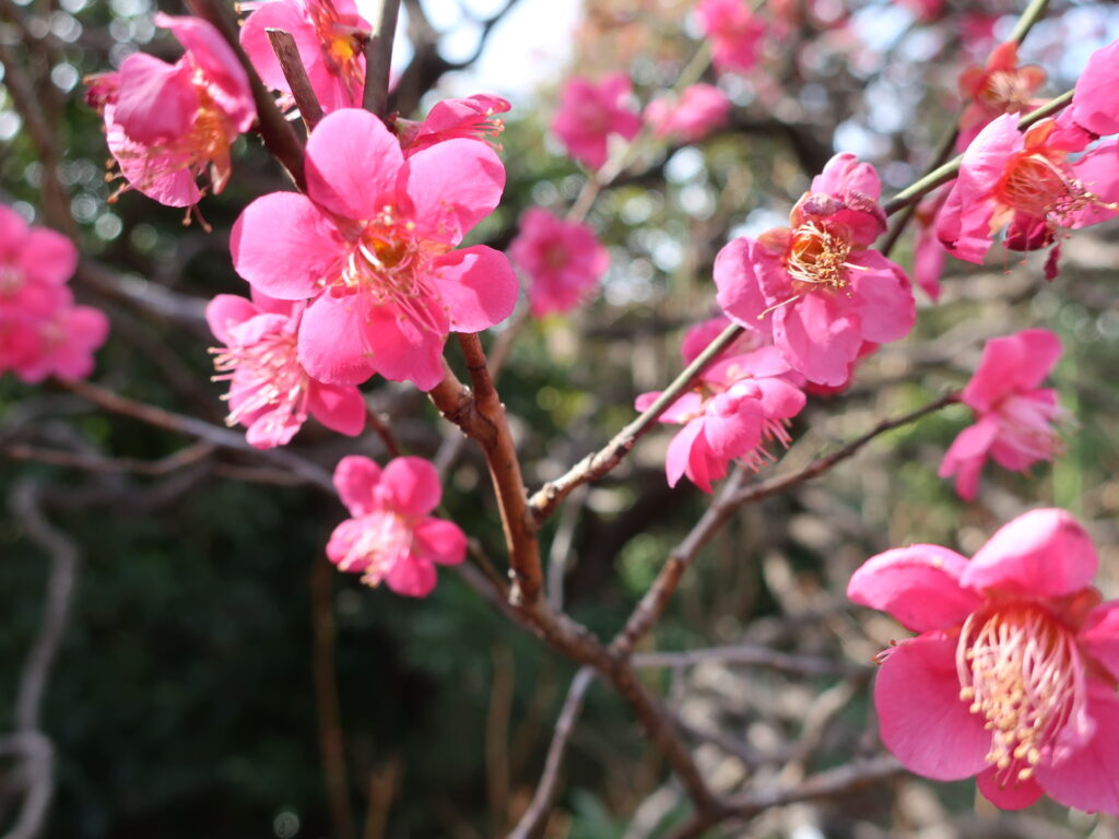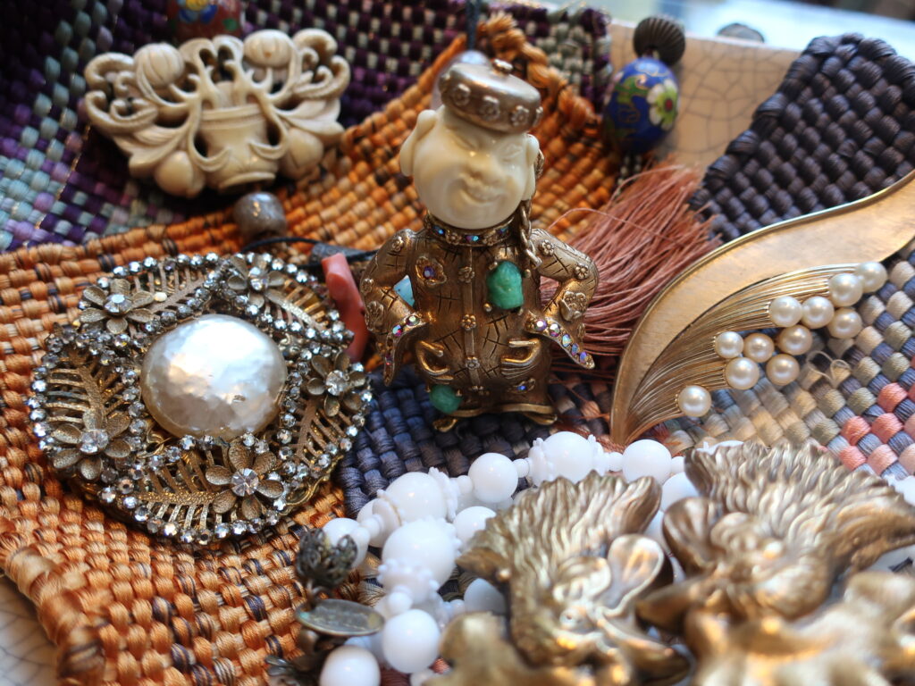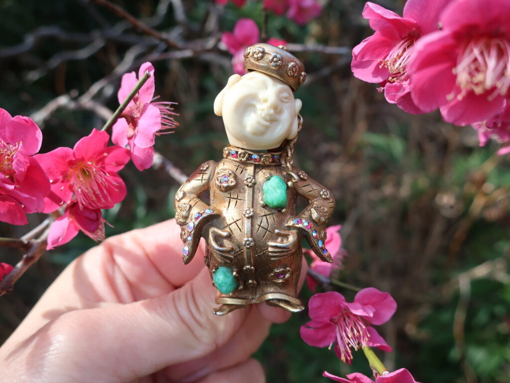 この赤い梅が似合うと外で撮影しました。HARのアジアンマンのブローチ、全身バージョンは何年振りかでやってきました!やはり迫力に圧倒されます。コスチュームジュエリーコレクター様にも自信を持っておすすめしたい逸品ですが早速お迎えいただく先が決まりました。ありがとうございます。