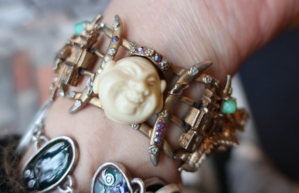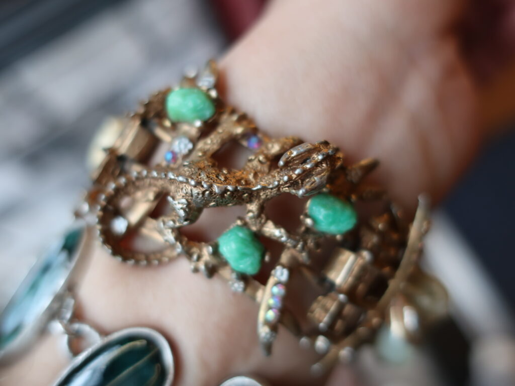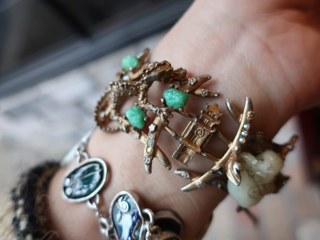 最後に一番豪華なブレスレットの写真をお届けいたします。ドラゴンにお城と更に見どころいっぱいです。そしてお店には春らしいブローチなど続々届いています。ぜひご来店をお待ちしております。