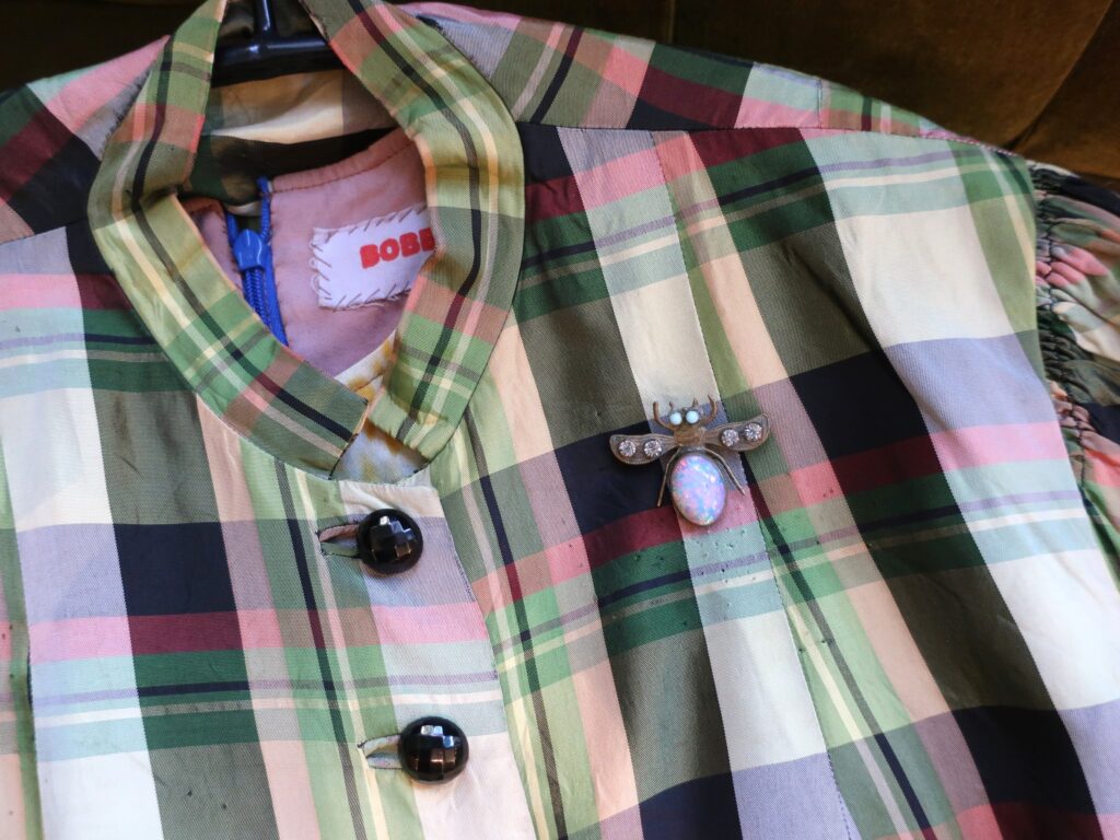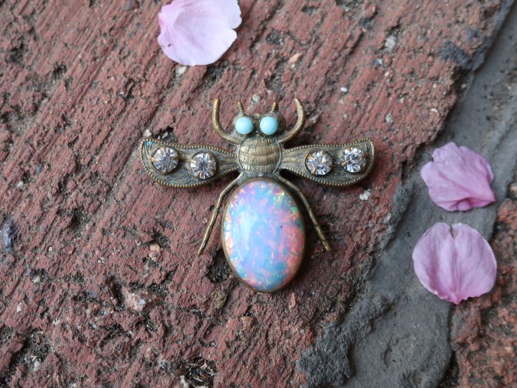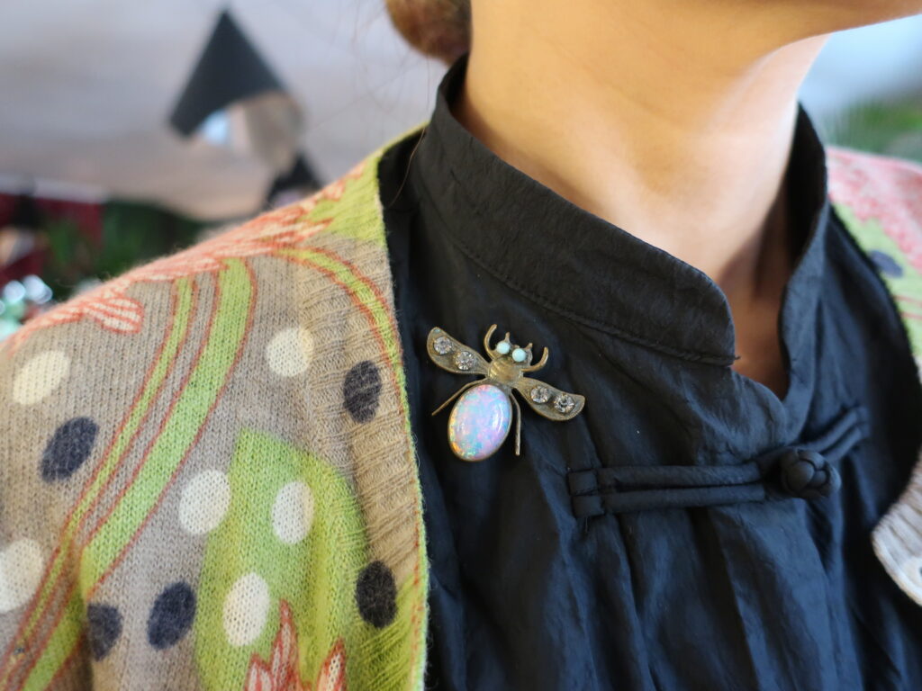 そして虫のブローチ。虫ブローチを密かにコレクションしている私としましては自分のもとに迎えたいなとも思う、色も綺麗で軽くて着けやすい、ブランドものではないから一度逃すとなかなか出会えないブローチです。金属部分は真鍮製。燻したゴールドがシックです。大きなオパールを模したガラスのカボションにターコイズ風の目、羽根に留められたラインストーンは爪留めされ、更に石枠部分にミルクグレンの細工が施されアンティークジュエリーのような雰囲気を味わえます。