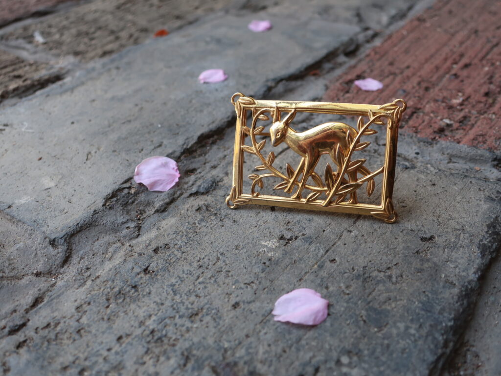 暖かくて風の強かった土曜日、お店の前にはピンクの桜の花びらがどんどん飛んできてとても綺麗でした。というわけでオンラインショップも春らしいデザインのブローチを2点掲載しました。1点はCOROの鹿のブローチです。額縁で切り取られたような森の景色が広がる絵になるブローチ。明るいゴールド色が華やかでデザインにも合っています。