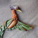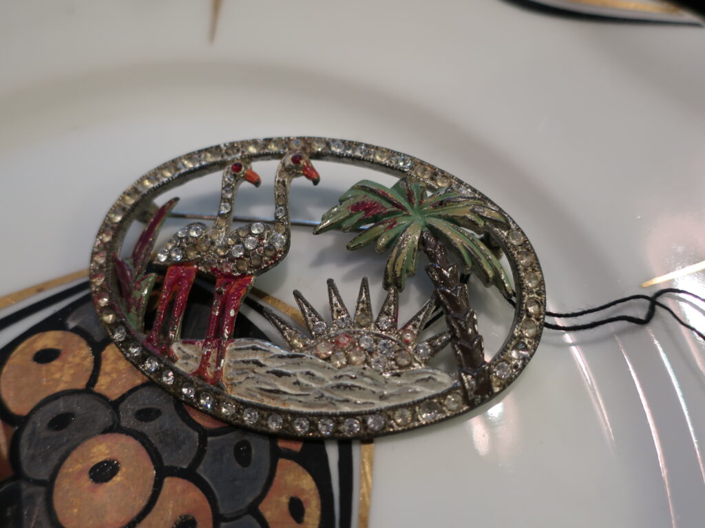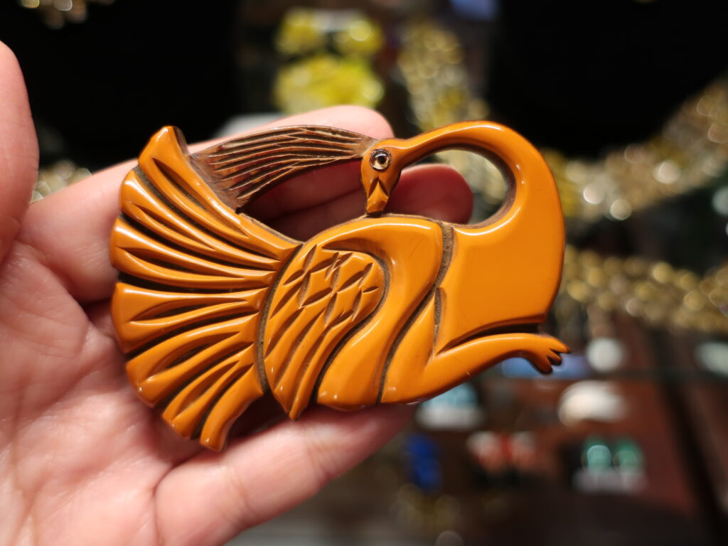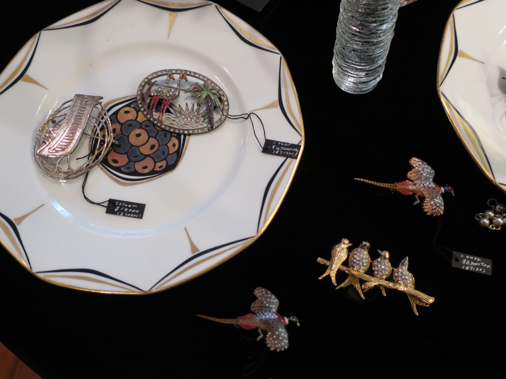 最近鳥づいているのが漏れ出てしまったようで富美菊さんに「最近鳥ですよね。やっといいものを見つけました!」と鳥が一面に描かれた花瓶を誕生日プレゼントにいただきました。確かに仕入れたブローチ以外にも身近に鳥の話題がつきません。(上の写真はベークライト製の鳥のブローチです。)