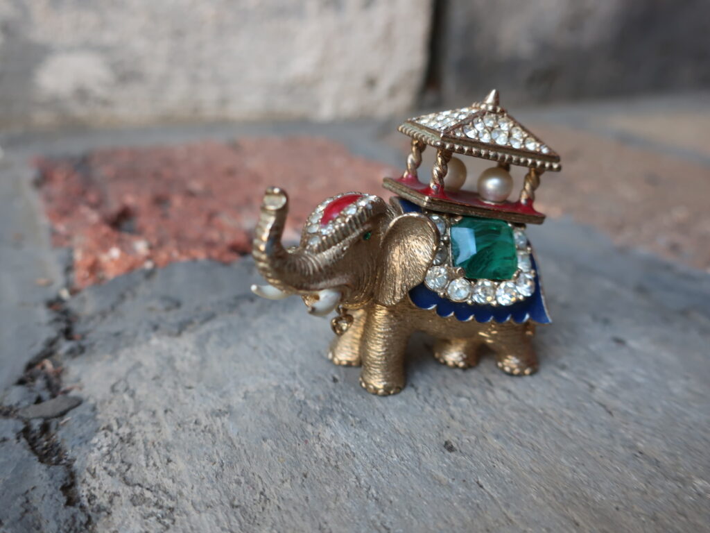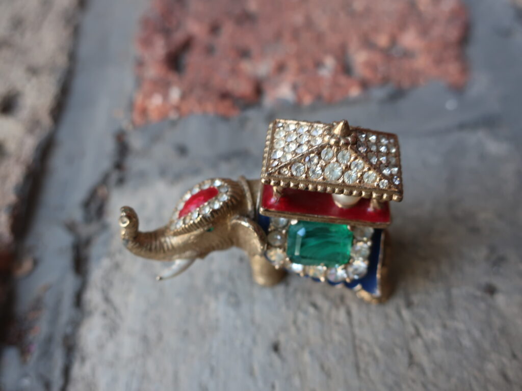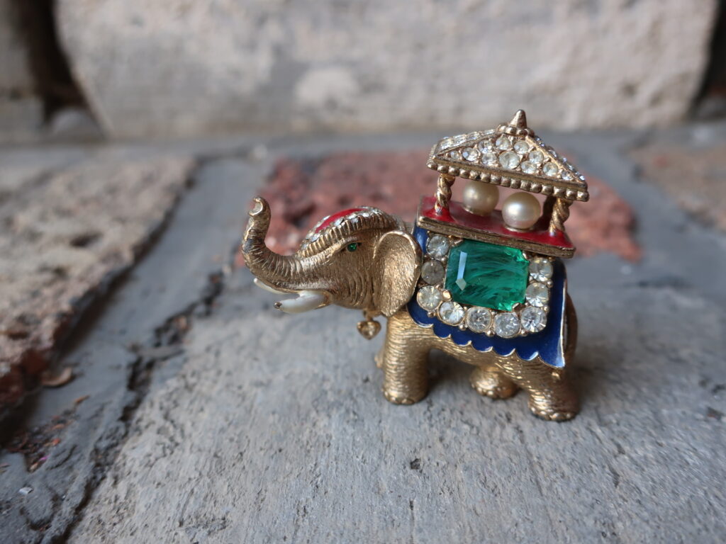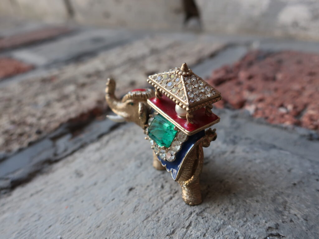 以前の象はデフォルメされたつるんとしたエナメルの美しい象でしたが今回の象はストーリーが想像できそうな表情のある印象的な一頭でした。そして留められたエメラルド風のカットストーンがとてもいい色でした。インクルージョンを含んだように作られたグリーンのガラスは本物のエメラルドの特性をしっかり意識しているようでそれも「いい!」と言いたくなるポイント。
