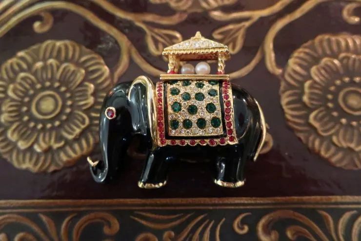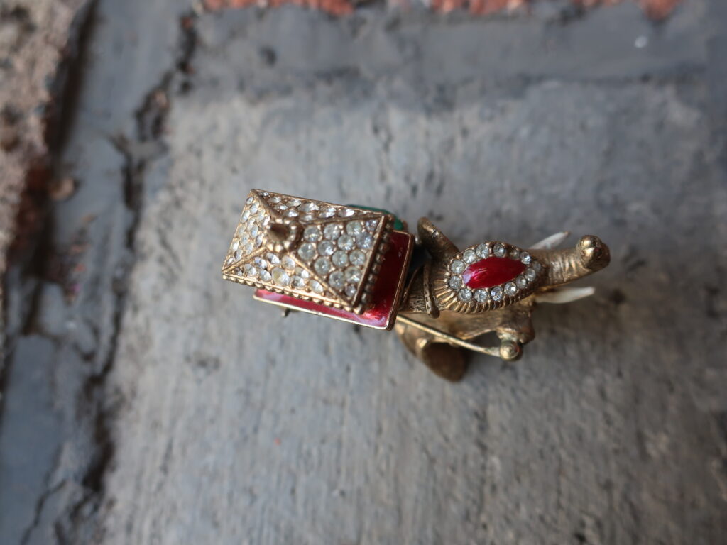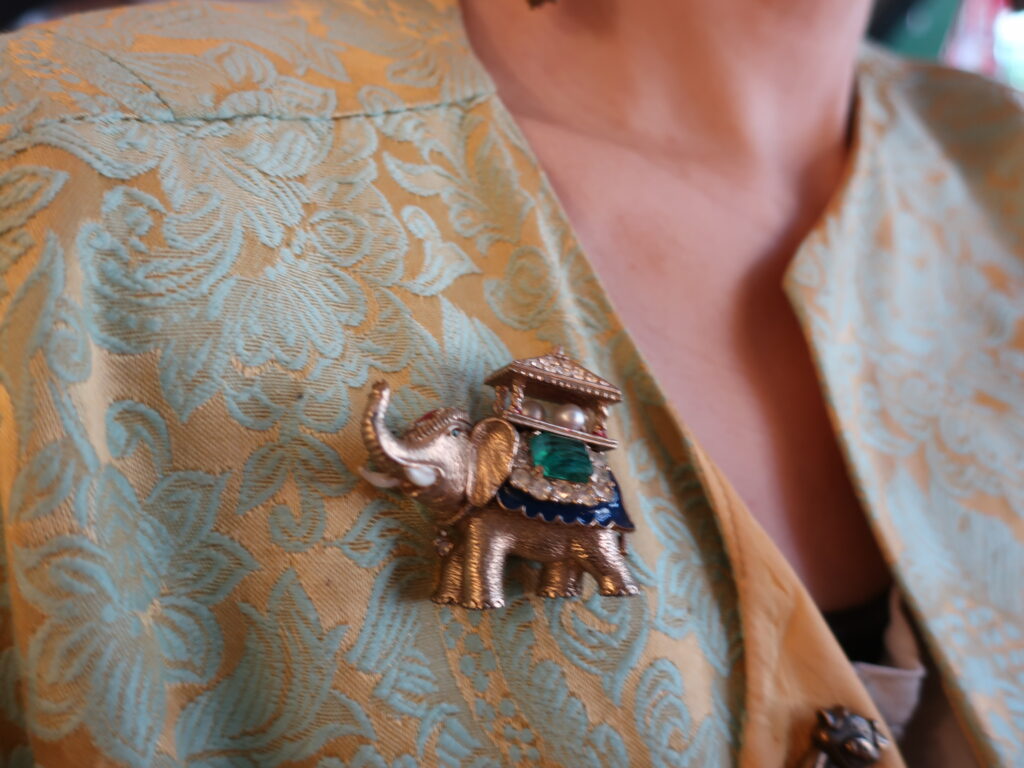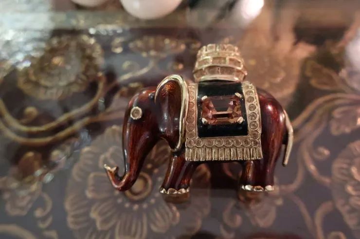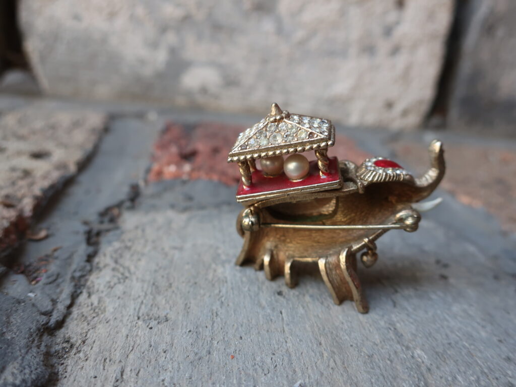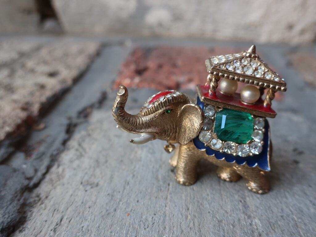 以前の象はデフォルメされたつるんとしたエナメルの美しい象でしたが今回の象はストーリーが想像できそうな表情のある印象的な一頭でした。そして留められたエメラルド風のカットストーンがとてもいい色でした。インクルージョンを含んだように作られたグリーンのガラスは本物のエメラルドの特性をしっかり意識しているようでそれも「いい!」と言いたくなるポイント。