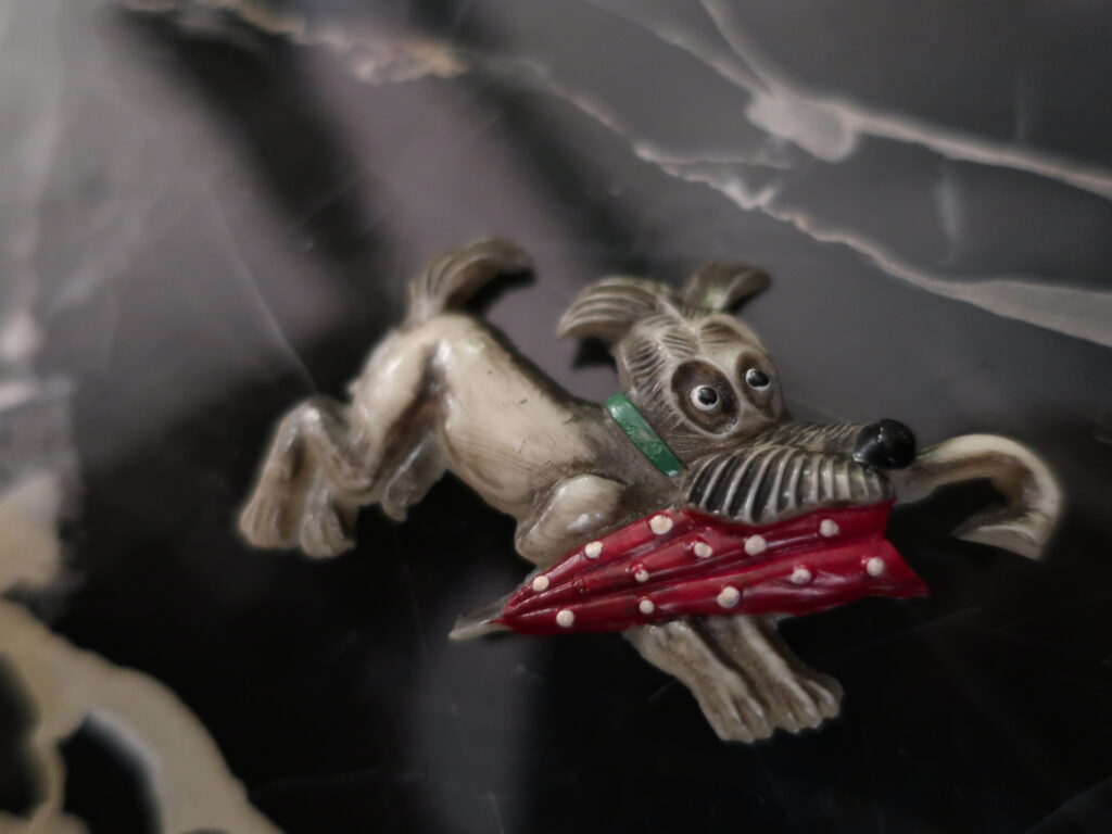 セルロイドのわんこは1940年代に日本で作られてアメリカで販売されていたものですが発売当時の台紙が付いたままの未使用品。長い間使われないまま眠っていたわんこの飼い主様を今年は絶賛募集中です。ぜひ雨の日のお出かけのお供に沢山つけてお出かけいただけると嬉しいです。表情がとてもかわいらしいです。オンラインショップ【プラスチック・ベークライト】のコーナーに掲載しました。