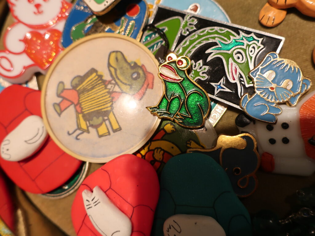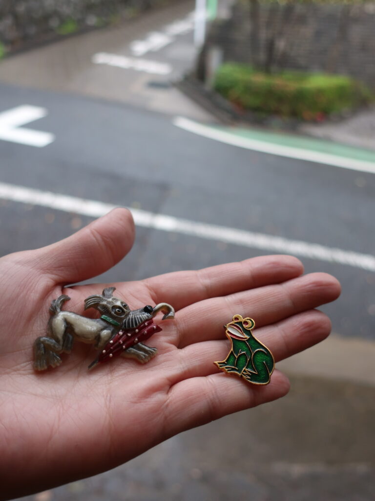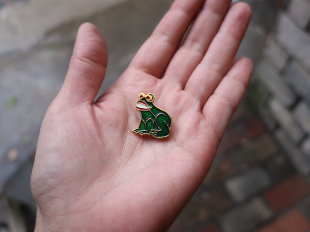 そして小さなカエルのブローチは1980年代のソビエト製。襟に胸にチョンとポイントに着けられます。小さいですがゴールドの縁取りとはっきりとした赤、白、緑が目立つので目立たないなんてことはありません。