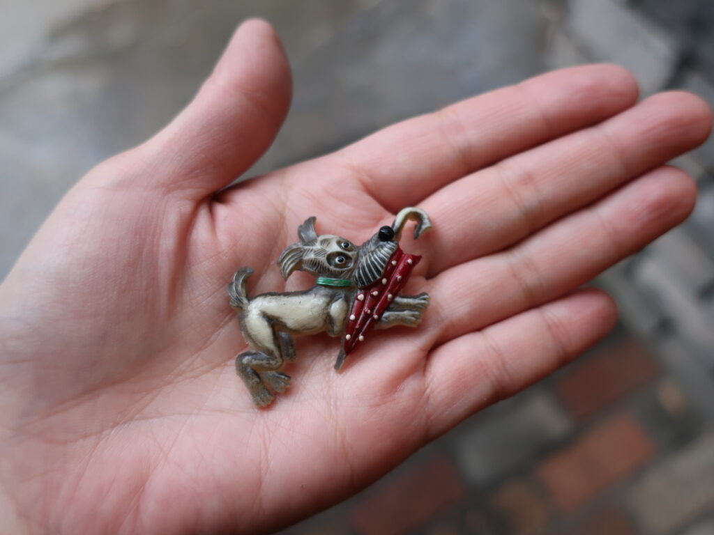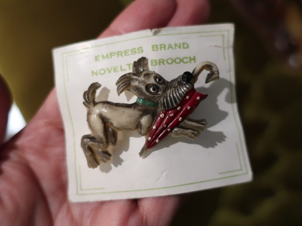 梅雨のころに出そうかと温存していた傘を咥えて走るテリアのブローチと綺麗なグリーンのエナメルの色がポイントのソビエトのカエルのブローチをオンラインショップに先ほど掲載しました。