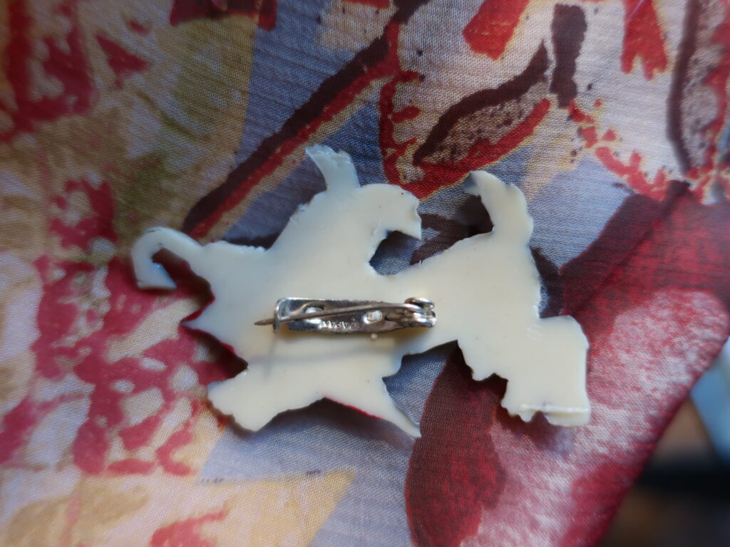 かなり古いものなのでブローチピンのロックがありません。ブローチピンがブローチの大きさに対して小さめですが、素材が軽いのでつけてみるとパタパタも気にならず着けられました。
