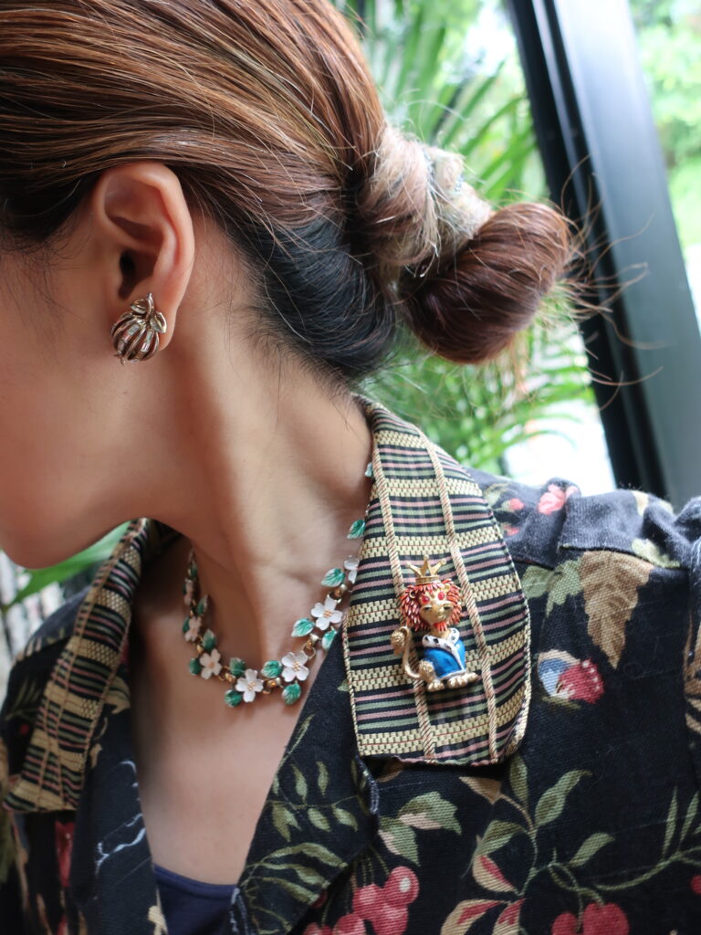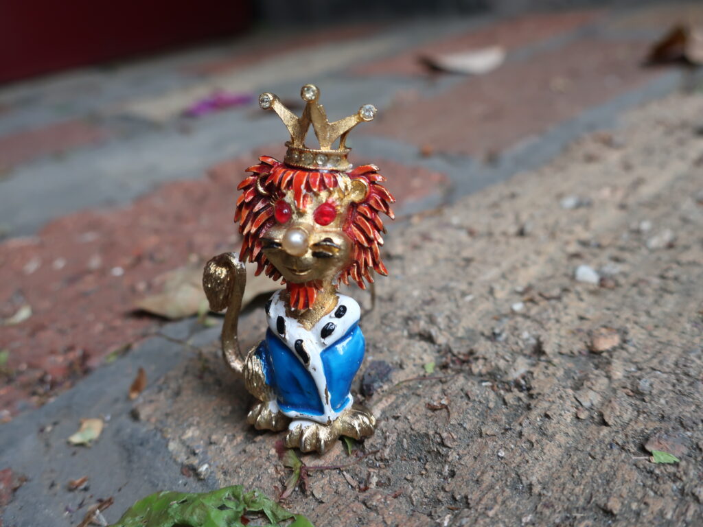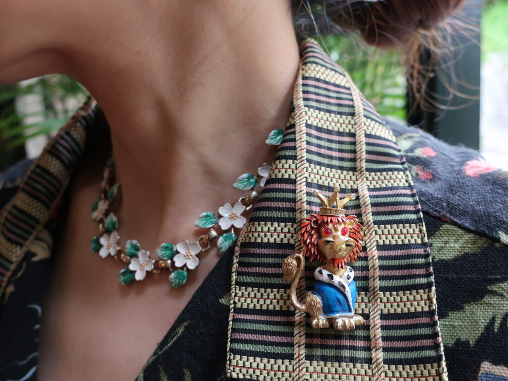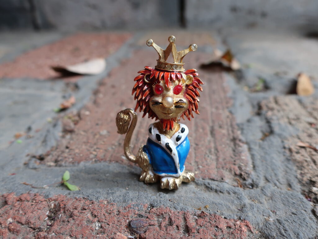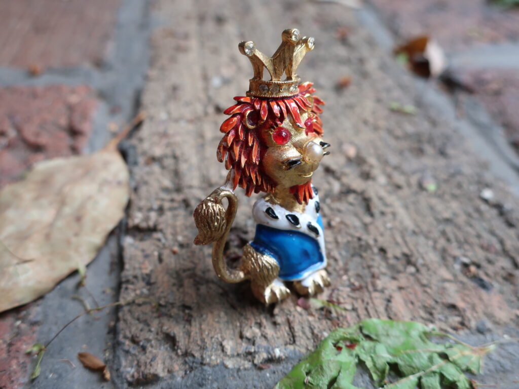 1960年代製のJJのブローチが届きました。ライオンキングのブローチです。経年によるエナメルの剥がれ、目に嵌められた赤い石に左右差がありますが、それを上回る魅力が詰まった頼もしさ100%のデザインです。