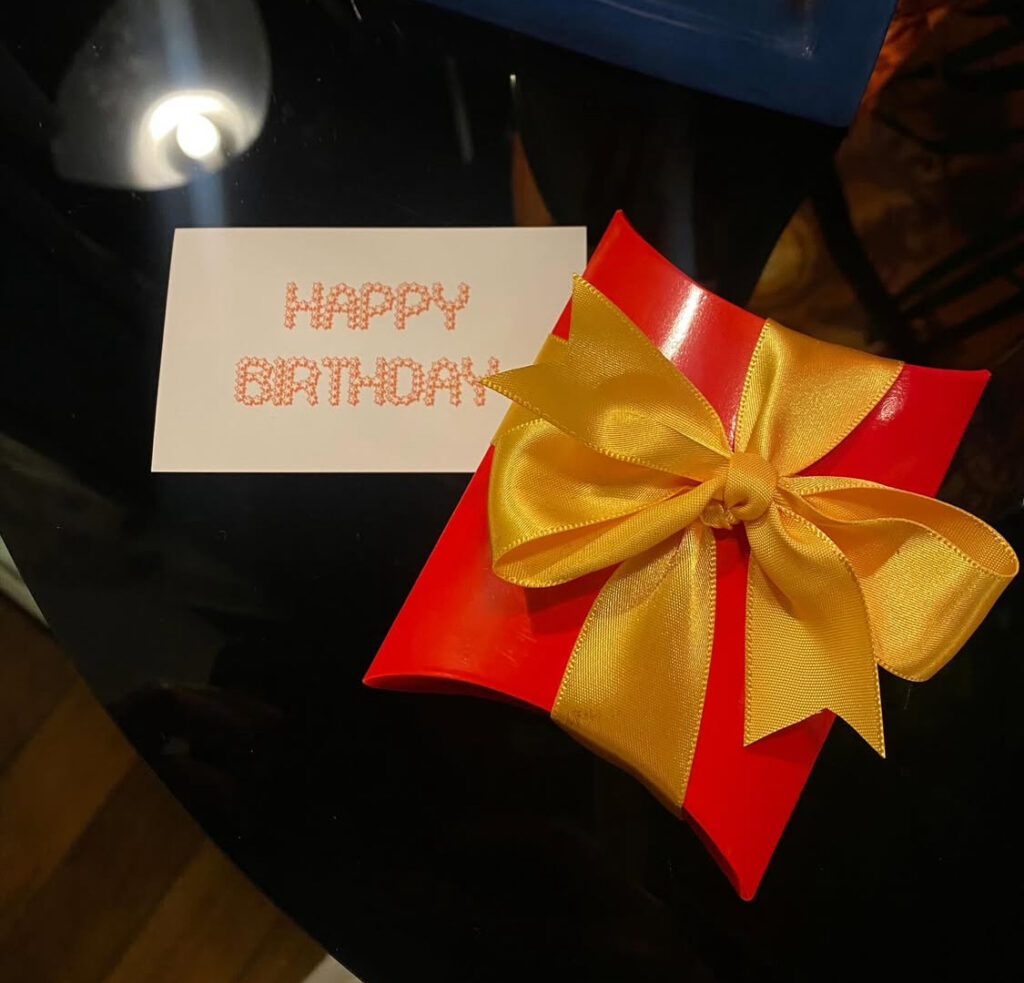 写真は娘さんへのプレゼントに選んでいただいたブローチのラッピング。いつもは黒い箱に入れることが多いのですが若いお嬢さんへのプレゼントなのでパッと鮮やかな赤い箱に黄色いリボンをかけました。
