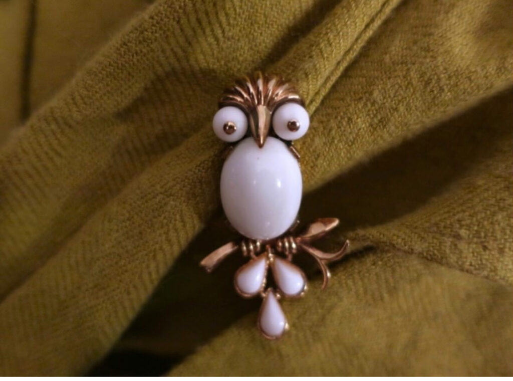 ◆ 1950’s Trifari milk glass owl brooch