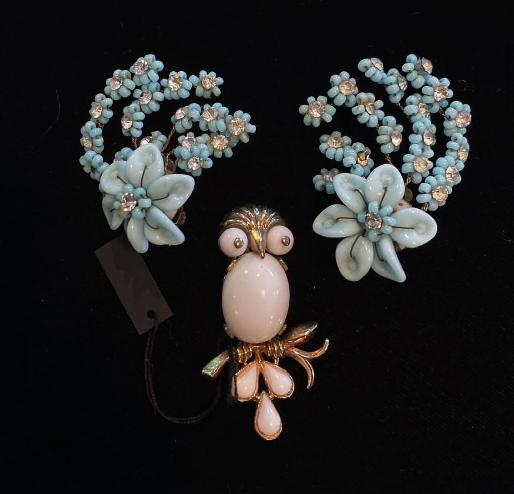 ◆ ビーズで編まれたお花のイヤリング。お客様とコーディネートを考えているときにtrifariのフクロウと並べたら🦉なんか宝塚の方の羽飾りに見えました。