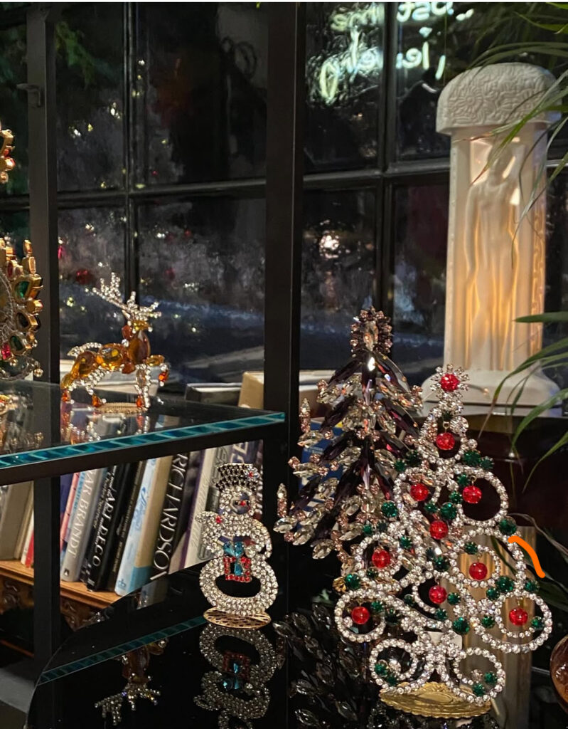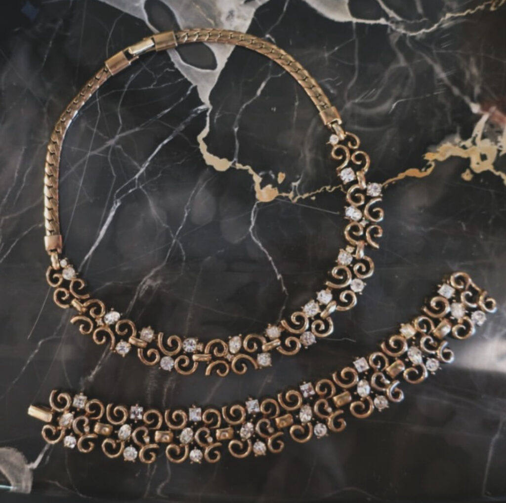 トリファリのネックレスとブレスレット。くるくるのモチーフと⭕️🔲様々な形のラインストーンがリズムよくならんでいます。ネックレス、ブレスレット共にとても美しいデザイン。