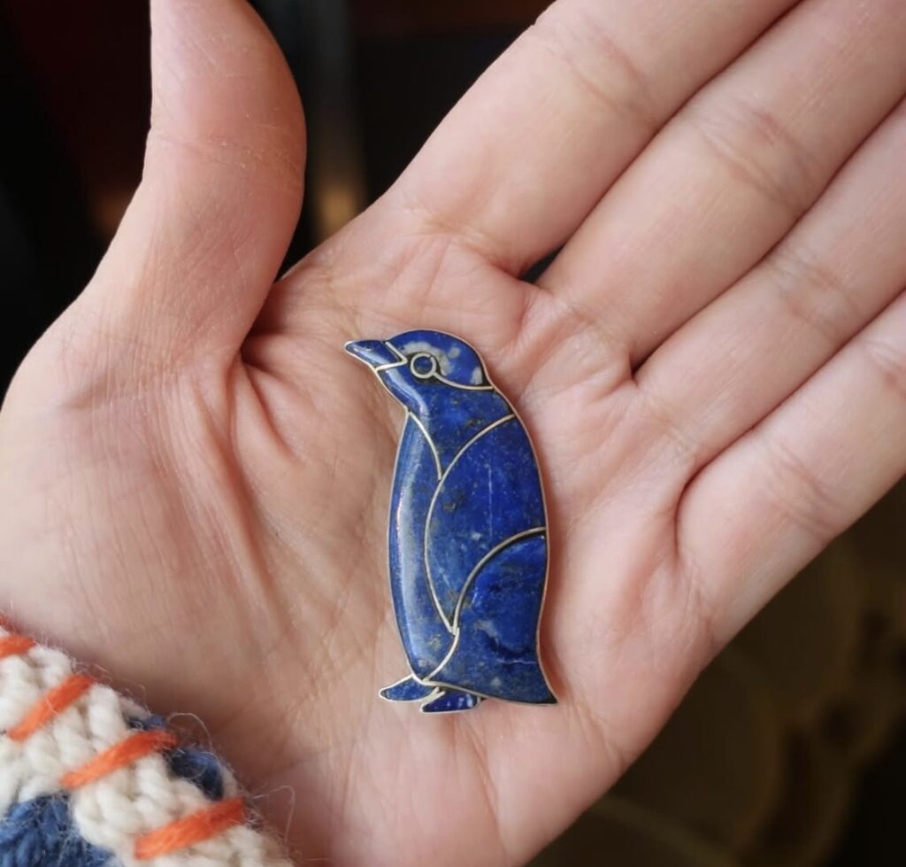 ◆見れば見るほど可愛かった青ペンギン。早速旅立ったラピスラズリstone inlay のブローチ。メキシコ製ペンギンということで先日 @mistico_disco さんで購入したボリビアのセーターに合わせました。同じ南米出身!🐧ステンドグラスや有線七宝の製作技法にも通じるところがあるように思えてその辺も気に入ったポイント。