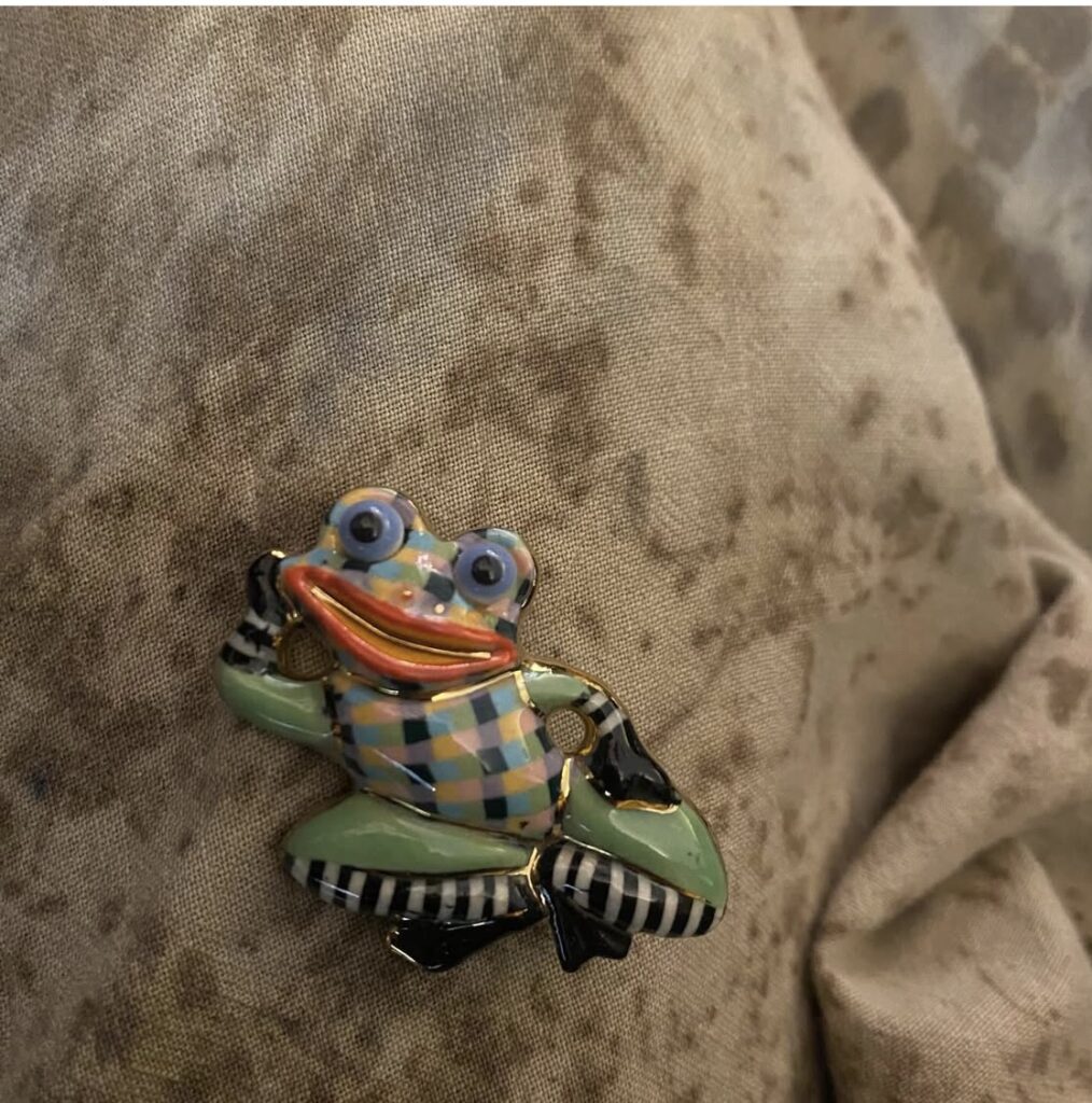 Maybe it’s time for a little coffee break.The frog brooch in the photo, looking like it’s taking a rest, is a ceramic brooch by Cynthia Chuang.