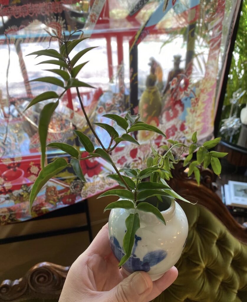 ◆ 週初めは植物のお手入れから。鳥籠の中のジャズミン、お店の上の庭から元気な新芽を。
