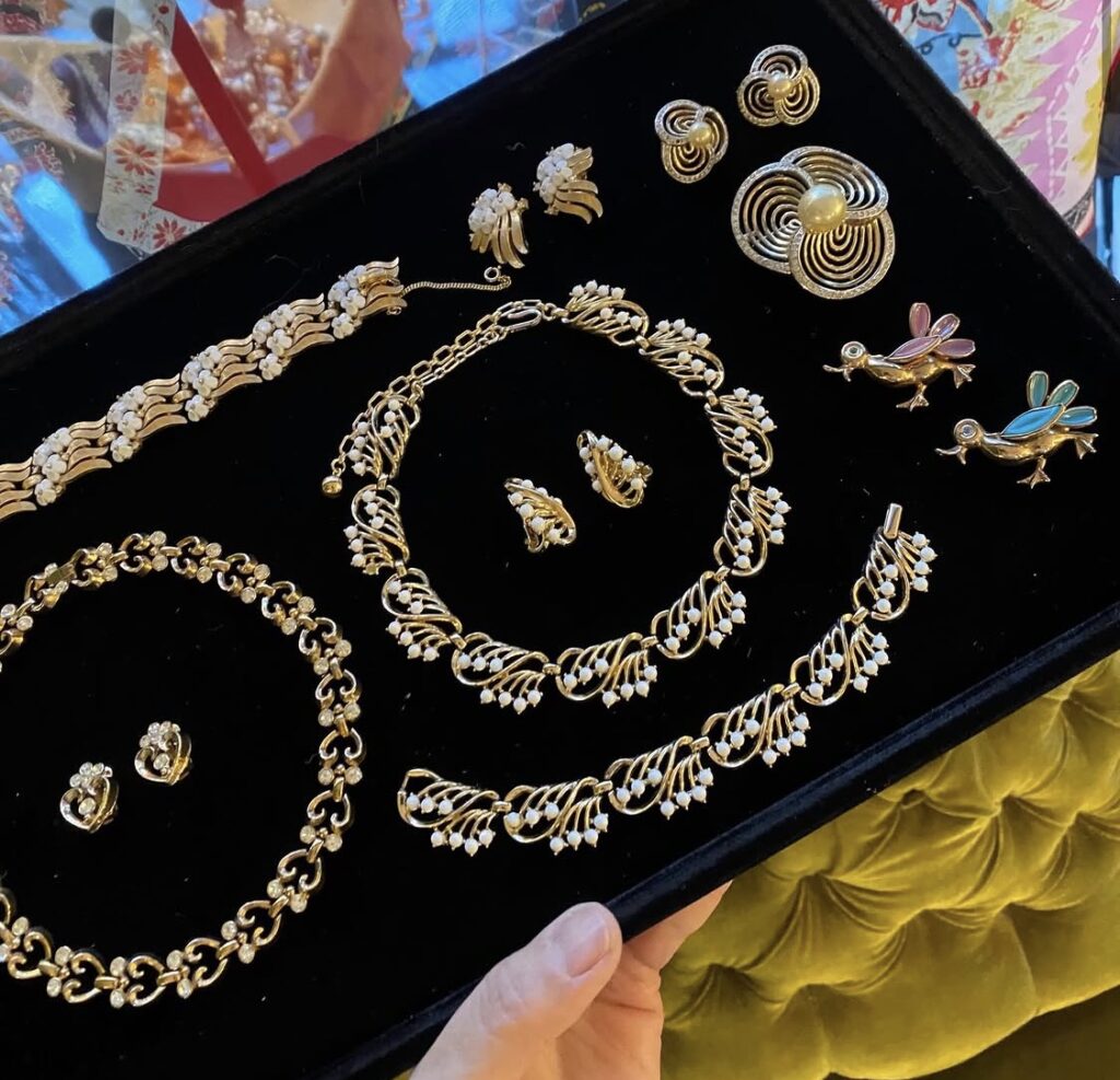 ◆ お客様が以前お買い上げいただいたtrifariのミルクガララスのフクロウのブローチをつけてきてくださいました。あわせていらっしゃるお花のブローチもtrifariの同時期のものです。